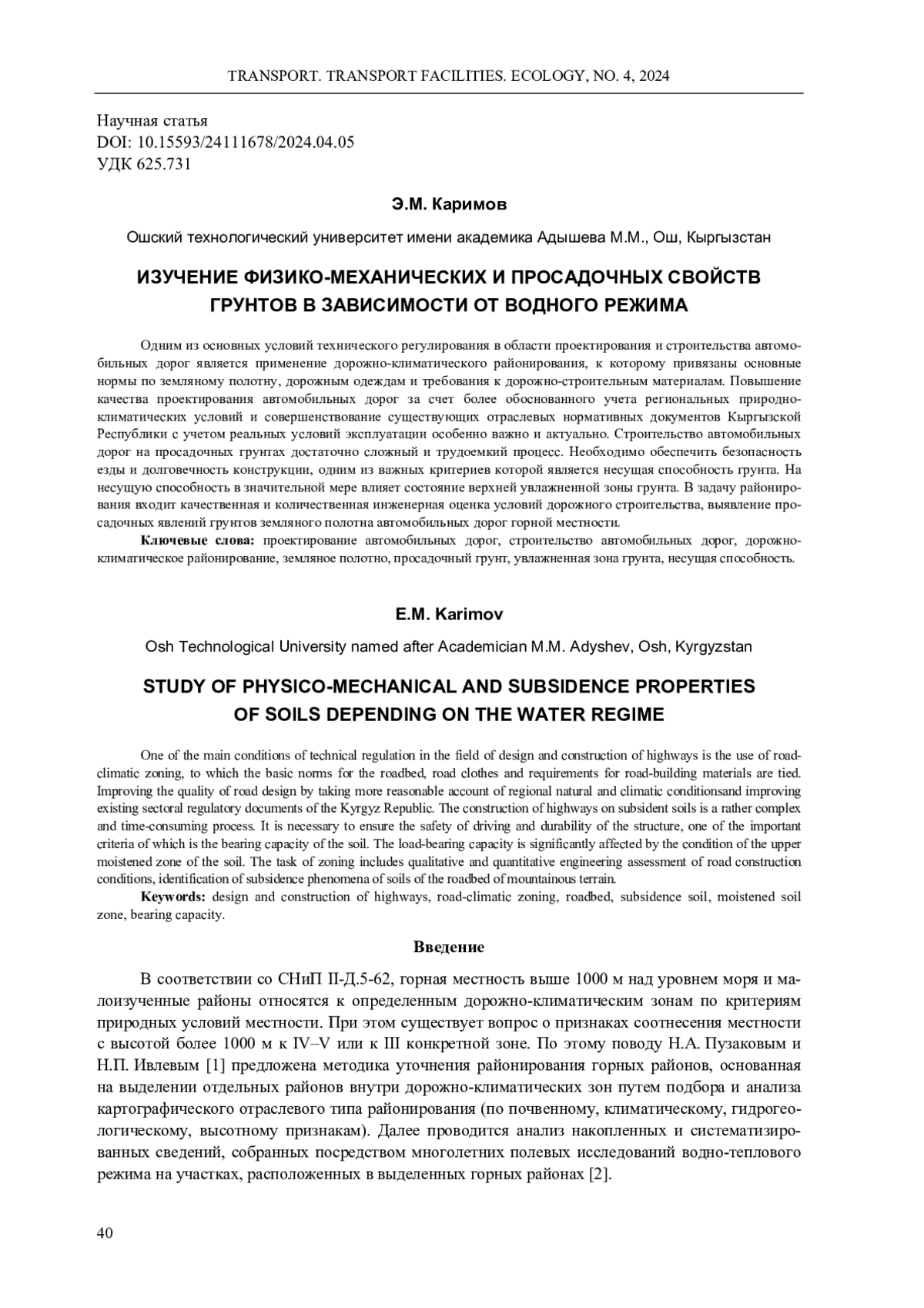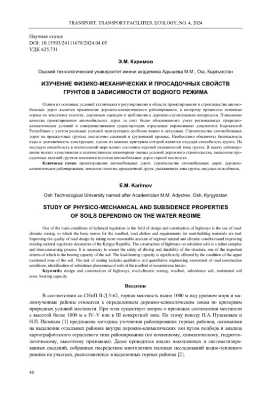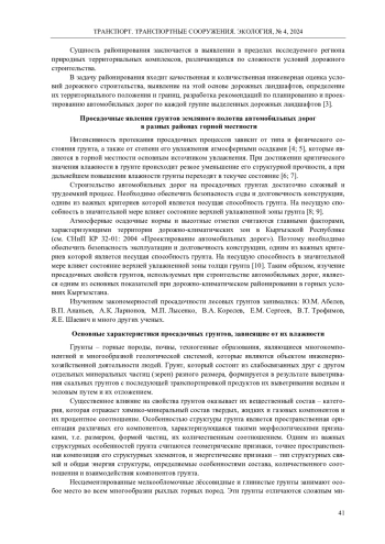 Одним из основных условий технического регулирования в области проектирования и строительства автомобильных дорог является применение дорожно-климатического районирования, к которому привязаны основные нормы по земляному полотну, дорожным одеждам и требования к дорожно-строительным материалам. Повышение качества проектирования автомобильных дорог за счет более обоснованного учета региональных природно-климатических условий и совершенствование существующих отраслевых нормативных документов Кыргызской Республики с учетом реальных условий эксплуатации особенно важно и актуально. Строительство автомобильных дорог на просадочных грунтах достаточно сложный и трудоемкий процесс. Необходимо обеспечить безопасность езды и долговечность конструкции, одним из важных критериев которой является несущая способность грунта. На несущую способность в значительной мере влияет состояние верхней увлажненной зоны грунта. В задачу районирования входит качественная и количественная инженерная оценка условий дорожного строительства, выявление просадочных явлений грунтов земляного полотна автомобильных дорог горной местности.