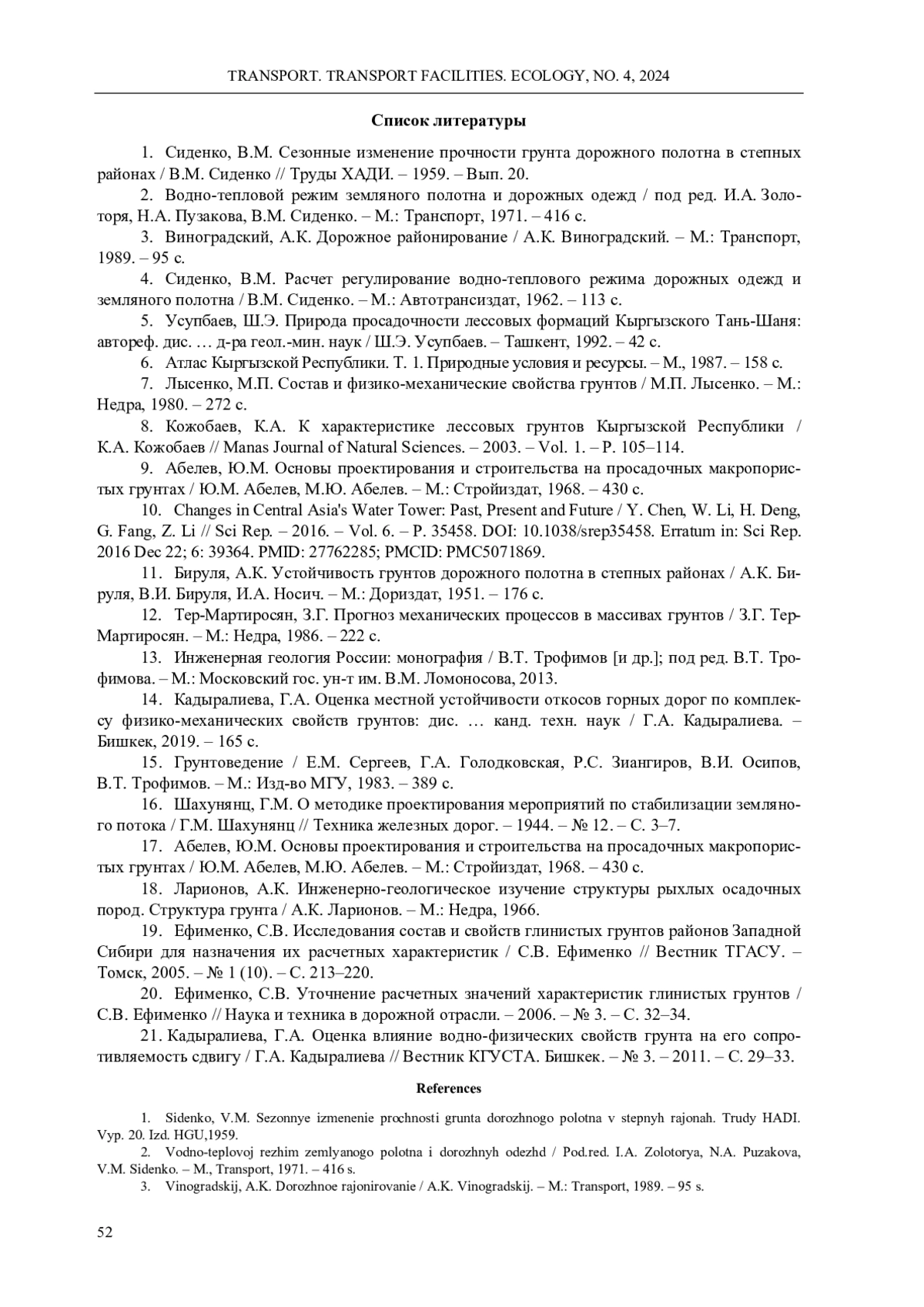 1. Сиденко, В.М. Сезонные изменение прочности грунта дорожного полотна в степных районах / В.М. Сиденко // Труды ХАДИ. - 1959. - Вып. 20.
