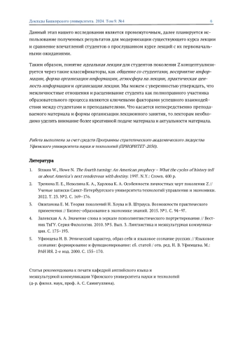 2. Тренина П. Е., Неволина К. А., Харлова К. А. Особенности личностных черт поколения Z // Ученые записки Санкт-Петербургского университета технологий управления и экономики. 2022. Т. 23. №2. С. 169-176.