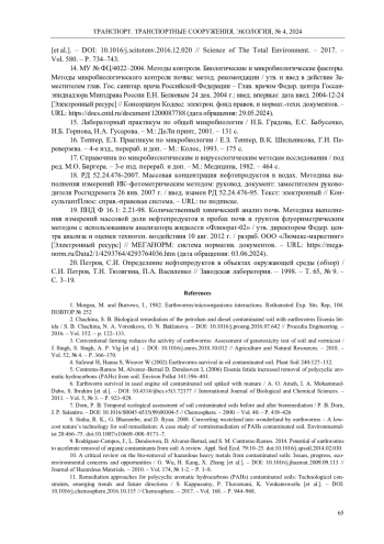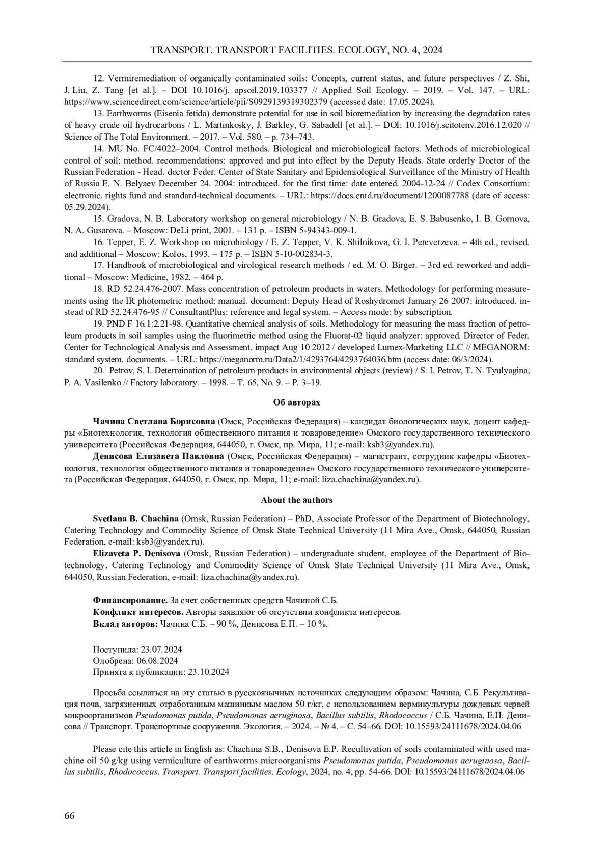 2. Chachina, S.B. Biological remediation of the petrolum and diesel contaminated soil with earthworms Eisenia Fetida / S.B. Chachina, N.A. Voronkova, O.N. Baklanova. - // Procedia Engineering. - 2016. - Vol. 152. - P. 122-133. DOI: 10.1016/j.proeng.2016.07.642 EDN: XFKTYX