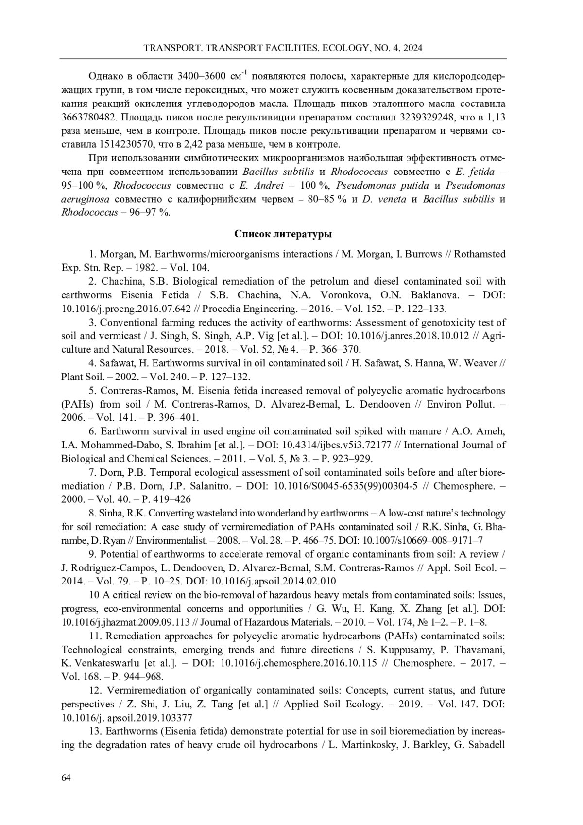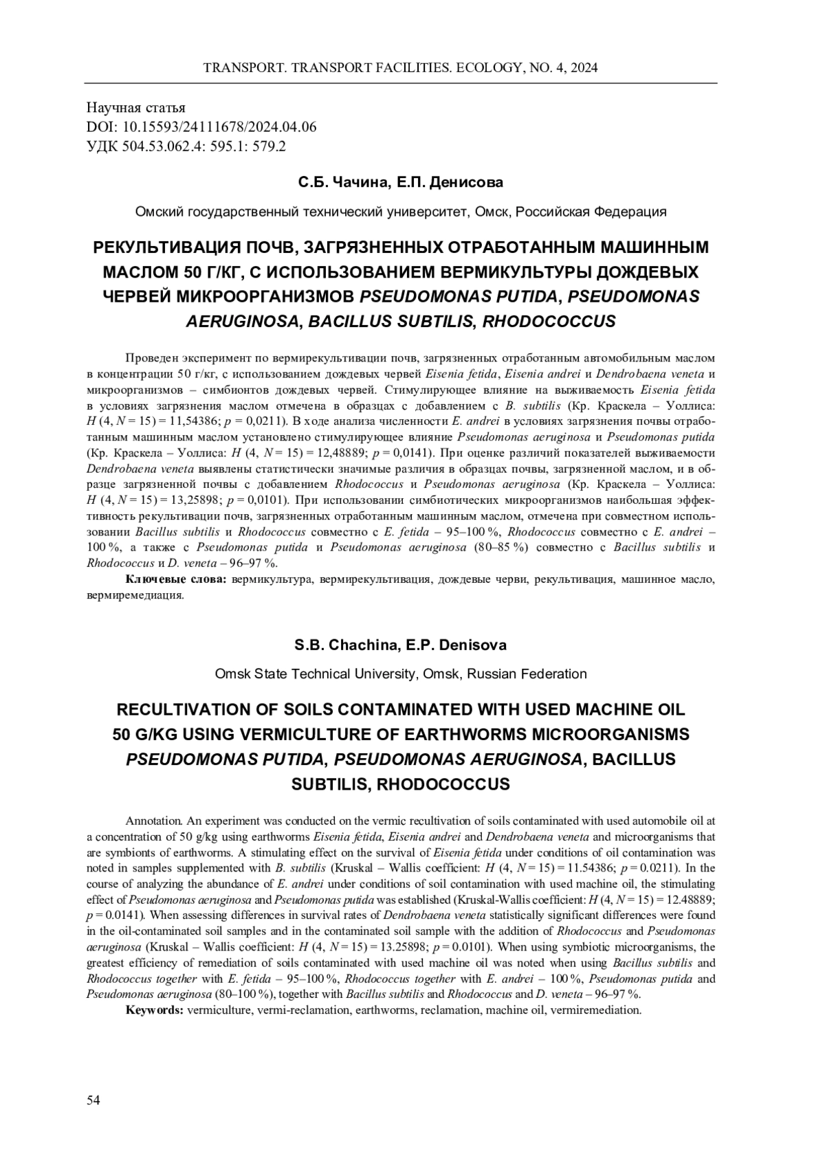 Проведен эксперимент по вермирекультивации почв, загрязненных отработанным автомобильным маслом в концентрации 50 г/кг, с использованием дождевых червей Eisenia fetida, Eisenia andrei и Dendrobaena veneta и микроорганизмов - симбионтов дождевых червей. Стимулирующее влияние на выживаемость Eisenia fetida в условиях загрязнения маслом отмечена в образцах с добавлением с B. subtilis (Кр. Краскела - Уоллиса: H (4, N = 15) = 11,54386; p = 0,0211). В ходе анализа численности E. andrei в условиях загрязнения почвы отработанным машинным маслом установлено стимулирующее влияние Pseudomonas aeruginosa и Pseudomonas putida (Кр. Краскела - Уоллиса: H (4, N = 15) = 12,48889; p = 0,0141). При оценке различий показателей выживаемости Dendrobaena veneta выявлены статистически значимые различия в образцах почвы, загрязненной маслом, и в образце загрязненной почвы с добавлением Rhodococcus и Pseudomonas aeruginosa (Кр. Краскела - Уоллиса: H (4, N = 15) = 13,25898; p = 0,0101). При использовании симбиотических микроорганизмов наибольшая эффективность рекультивации почв, загрязненных отработанным машинным маслом, отмечена при совместном использовании Bacillus subtilis и Rhodococcus совместно с E. fetida - 95-100 %, Rhodococcus совместно с E. аndrei - 100 %, а также с Pseudomonas putida и Pseudomonas aeruginosа (80-85 %) совместно с Bacillus subtilis и Rhodococcus и D. veneta - 96-97 %.