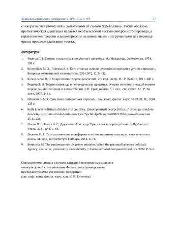 2. Конурбаев М. Э., Ганеева Э. Р. Когнитивные основы речевой компрессии в устном переводе // Вопросы когнитивной лингвистики. 2024. №2. С. 24-32. EDN: RZOWZR
