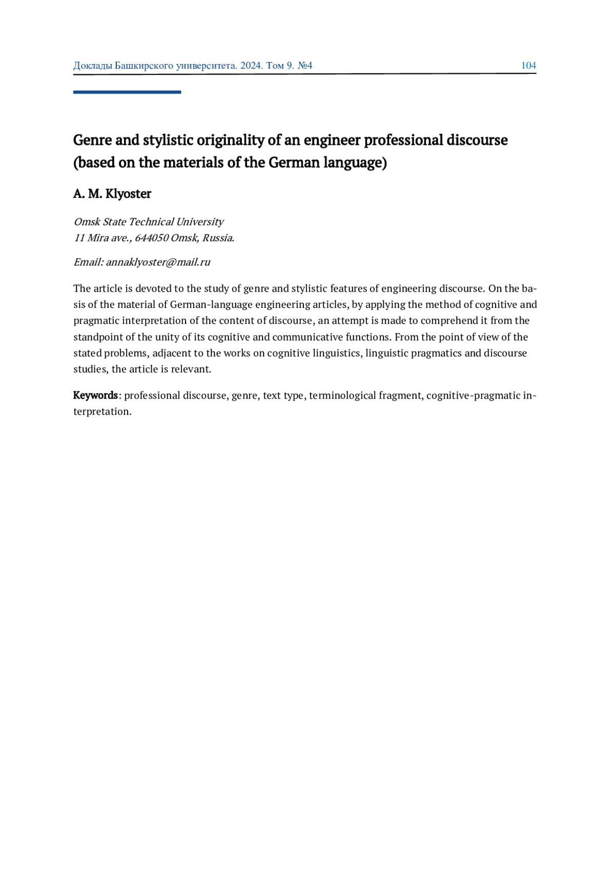 Статья посвящена изучению жанрово-стилистических особенностей инженерного дискурса. На материале немецкоязычных статей инженерной направленности посредством метода когнитивной и прагматической интерпретации содержания дискурса предпринимается попытка его осмысления с позиций единства его когнитивной и коммуникативной функций. С точки зрения заявленной проблематики, примыкая к работам по когнитивной лингвистике, лингвистической прагматике и дискурсологии, статья является актуальной.