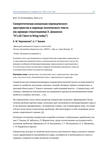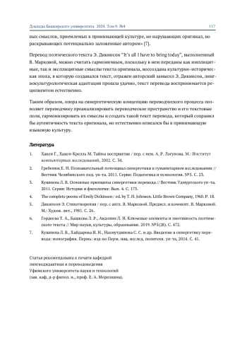 7. Кушнина Л. В., Хайдарова И. Н., Назмутдинова С. С. и др. Введение в синергетику перевода: монография. Пермь: изд-во Перм. нац. исслед. политехн. ун-та, 2014. С. 41. EDN: VCRMJD