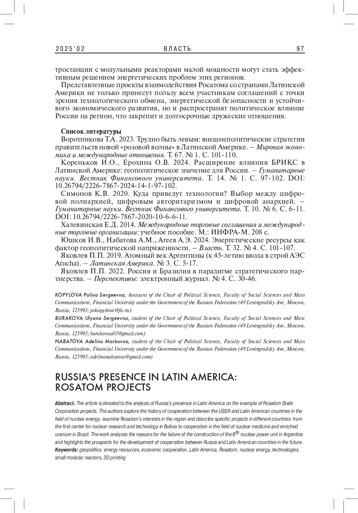2. Кореньков И.О., Ерохина О.В. 2024. Расширение влияния БРИКС в Латинской Америке: геополитическое значение для России. - Гуманитарные науки. Вестник Финансового университета. Т. 14. № 1. С. 97-102. DOI: 10.26794/2226-7867-2024-14-1-97-102 EDN: MGRXBC