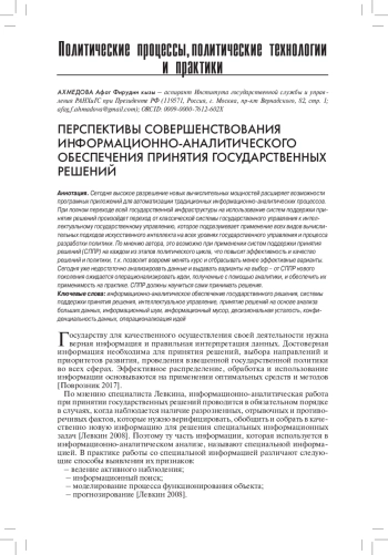Сегодня высокое разрешение новых вычислительных мощностей расширяет возможности программных приложений для автоматизации традиционных информационно-аналитических процессов. При полном переходе всей государственной инфраструктуры на использование систем поддержки принятия решений произойдет переход от классической системы государственного управления к интеллектуальному государственному управлению, которое подразумевает применение всех видов вычислительных подходов искусственного интеллекта на всех уровнях государственного управления и процесса разработки политики. По мнению автора, это возможно при применении систем поддержки принятия решений (СППР) на каждом из этапов политического цикла, что повысит эффективность и качество решений и политики, т. к. позволит вовремя менять курс и отбрасывать менее эффективные варианты. Сегодня уже недостаточно анализировать данные и выдавать варианты на выбор - от СППР нового поколения ожидается операционализировать идеи, полученные с помощью аналитики, и обеспечить их применимость на практике. СППР должны научиться сами принимать решения.