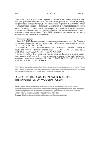 1. Ежов Д.А. 2024. Трансформация института политических партий в России в условиях цифровизации и виртуализации. - Социально-гуманитарные знания. № 10. С. 156-159. EDN: NSWZLP