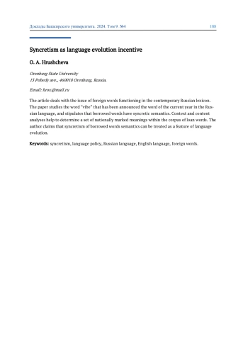 Статья посвящена исследованию специфики функционирования англоязычных заимствований в современном русском языке. На примере лексемы «вайб», объявленной словом 2024 г., демонстрируется синкретизм значения заимствованных лексических единиц. С использованием методов контекстуального и компонентного анализа описывается специфический набор национально-маркированных смыслов заимствованных лексем. Автор отмечает, что синкретизм значения заимствований может трактоваться как признак языковой эволюции.