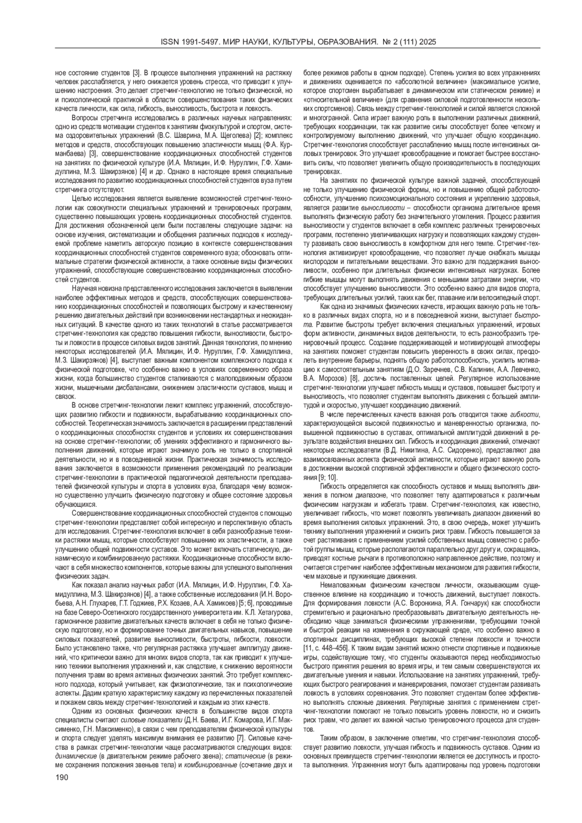 Актуальность выбранной проблемы исследования обусловлена тем, что современное образование требует от студентов не только глубоких знаний в сфере профиля подготовки, но и развитых координационных способностей, играющих ключевую роль в успешности будущей профессиональной деятельности. Следует также отметить, что в условиях современных цифровых трансформаций, открывающих новые горизонты для физической активности и спорта молодого поколения, одной из приоритетных задач образовательной организации становится обеспечение многостороннего и гармоничного развития двигательных качеств обучающихся, интеграция инновационных подходов к тренировкам и развитию физических навыков. «Большинство исследователей основным принципом создания нового считают прогрессивное начало. Так, В. И. Загвязинский и И. Н. Емельянова полагают, что новое в педагогике – это не только идеи, подходы, методы, технологии, которые еще не выдвигались или не использовались, но это и тот комплекс элементов или отдельные элементы педагогического процесса, которые несут в себе прогрессивное начало, позволяющее в изменяющихся условиях и ситуациях достаточно эффективно решать задачи воспитания и образования» [1, с. 87]. Большинство видов деятельности нуждаются в четко скоординированных мышечных усилиях, функциональных возможностях организма. При этом одним из значимых условий является высокий уровень общей работоспособности студентов, их физического, психического и функционального состояний, обеспечивающих: мотивацию к физической активности; потребность в физкультурно-оздоровительной деятельности; развитие координационных способностей; овладение жизненными навыками и умениями ведения здорового образа жизни. Это создает синергетический эффект, позволяющий не только повысить физическую активность студентов, но и сформировать здоровый образ жизни, что является ключевым фактором для устойчивого развития образования в целом. В связи с этим внедрение инновационных технологий в процесс обучения, среди которых мы выделили стретчинг-технологию, становится особенно актуальным как один из видов гимнастики и физкультурно-оздоровительной деятельности. Стретчинг-технология (от английского «stretching» – растягивание, растяжка) в статье рассматривается как совокупность различных методов растяжки мышц и связок, направленных на улучшение гибкости, выносливости, быстроты и ловкости. Данная технология способствует также подвижности суставов, увеличению диапазона движений, предотвращению травм и улучшению общего физического состояния человека в целом. «Стретчинг оказывает комплексное воздействие на организм. Он улучшает кровообращение, способствует расслаблению мышц и уменьшению стресса. Регулярные занятия стретчингом повышают гибкость суставов, что важно для поддержания амплитуды движений и предотвращения травм, снижает риск суставных заболеваний и дегенеративных изменений позвоночника» [2, с. 158–161]. Кроме того, по мнению Ф. А. Курманбаевой, систематическая практика стретчинг-технологии оказывает положительное влияние на психоэмоциональное состояние студентов [3]. В процессе выполнения упражнений на растяжку человек расслабляется, у него снижается уровень стресса, что приводит к улучшению настроения. Это делает стретчинг-технологию не только фи