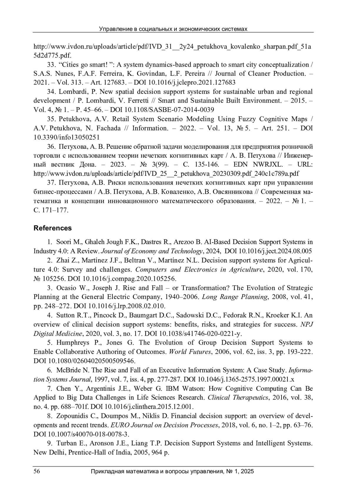 32. Петухова, А. В. Использование нечетких когнитивных карт для решения задачи развития муниципальных образований / А. В. Петухова, А. В. Коваленко, М. В. Шарпан // Инженерный вестник Дона. - 2024. - № 2(110). - С. 238-262. - URL: http://www.ivdon.ru/uploads/article/pdf/IVD_31__2y24_petukhova_kovalenko_sharpan.pdf_51a5d2d775.pdf. EDN: LTRFOG