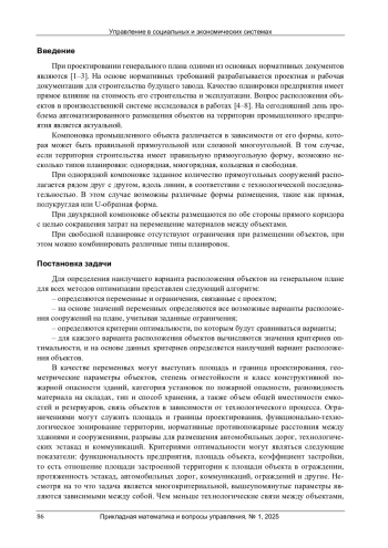 При проектировании генерального плана одними из основных нормативных документов являются [1–3]. На основе нормативных требований разрабатывается проектная и рабочая документация для строительства будущего завода. Качество планировки предприятия имеет прямое влияние на стоимость его строительства и эксплуатации. Вопрос расположения объектов в производственной системе исследовался в работах [4–8]. На сегодняшний день проблема автоматизированного размещения объектов на территории промышленного предприятия является актуальной