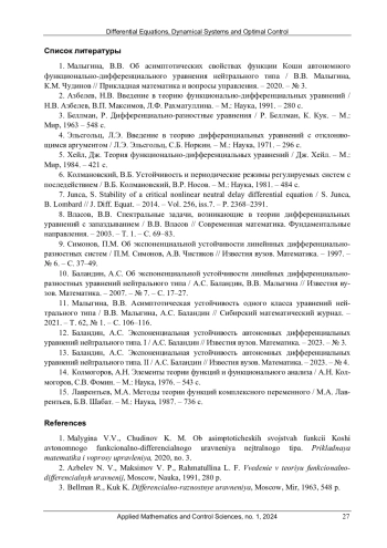1. Малыгина, В.В. Об асимптотических свойствах функции Коши автономного функционально-дифференциального уравнения нейтрального типа / В.В. Малыгина, К.М. Чудинов // Прикладная математика и вопросы управления. - 2020. - № 3. EDN: BALLGT