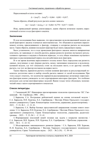 Основная задача факторного анализа - это выявление неявных факторов, объясняющих связи между наблюдаемыми переменными. Это дает возможность получить более полное и точное представление об изучаемых явлениях и процессах, что позволяет установить скрытые закономерности и тенденции, которые далеко не всегда возможно определить при визуальном анализе данных. Эти скрытые переменные могут быть использованы для упрощения данных и понимания основных механизмов, лежащих в основе изучаемого явления. Количественная оценка влияния каждой переменной на результат с помощью математических методов может быть выполнена с использованием различных подходов и инструментов. Приводится краткий обзор основного инструментария. Выбор конкретного метода зависит от характера данных, целей исследования и доступных ресурсов. Известно, что основным недостатком факторного анализа является невыполнение переместительного (коммуникативного) закона умножения, что объясняется возникновением неразложимого остатка. Неразложимый остаток объясняется тем, что рассматриваемая модель не полностью учитывает все факторы, влияющие на изучаемое явление, а поэтому вариация признака не будет определяться только рассматриваемыми факторами, то есть останется какая-то часть, не распределенная между факторами. В связи с этим величина влияния факторов на изменение результативного показателя меняется в зависимости от места, на которое поставлен тот или иной фактор в детерминированной модели. С увеличением числа факторов-сомножителей резко возрастает количество равноправных вариантов расчетов, так как увеличивается число возможных перестановок факторов. Таким образом, вариантов расчета степени влияния факторов на результирующий показатель достаточно много и выбор способа расчета зависит от целей исследования. При этом следует отметить, что количество вариантов, рассматриваемых возможных перестановок факторов можно уменьшить за счет агрегирования некоторых факторов. Важно только четко обосновать экономический смысл такого агрегированного показателя. Это обстоятельство дает возможность построения процедуры, позволяющей оценить неразложимый остаток. В статье рассматривается методика оценки неразложимого остатка. Величина неразложимого остатка может быть определена как разность данных, полученных в двух формах расчета, между значениями показателя в мультипликативной модели, где этот показатель стоит на последнем месте, и по другому способу расчета, где этот же фактор поставлен на первое место. Показано, что в ходе проведения факторного анализа имеется инвариантная константа, не зависящая от способа расчета. Приводится также способы уменьшения размерности исходной задача за счет агрегирования исходных факторов. Важно только четко обосновать экономический смысл такого агрегированного показателя. В статье приводится пример трехфакторной модели производительности труда, когда результативный показатель будет определяться тремя факторами: фондоотдачей, механовооруженностью рабочих и долей рабочих в общей численности предприятия. За счет объединения первых двух факторов в один произошла редукция задачи к двухфакторной модели производительности труда, зависящей от двух факторов: средней выработки рабочих и доли рабочих в общей чи