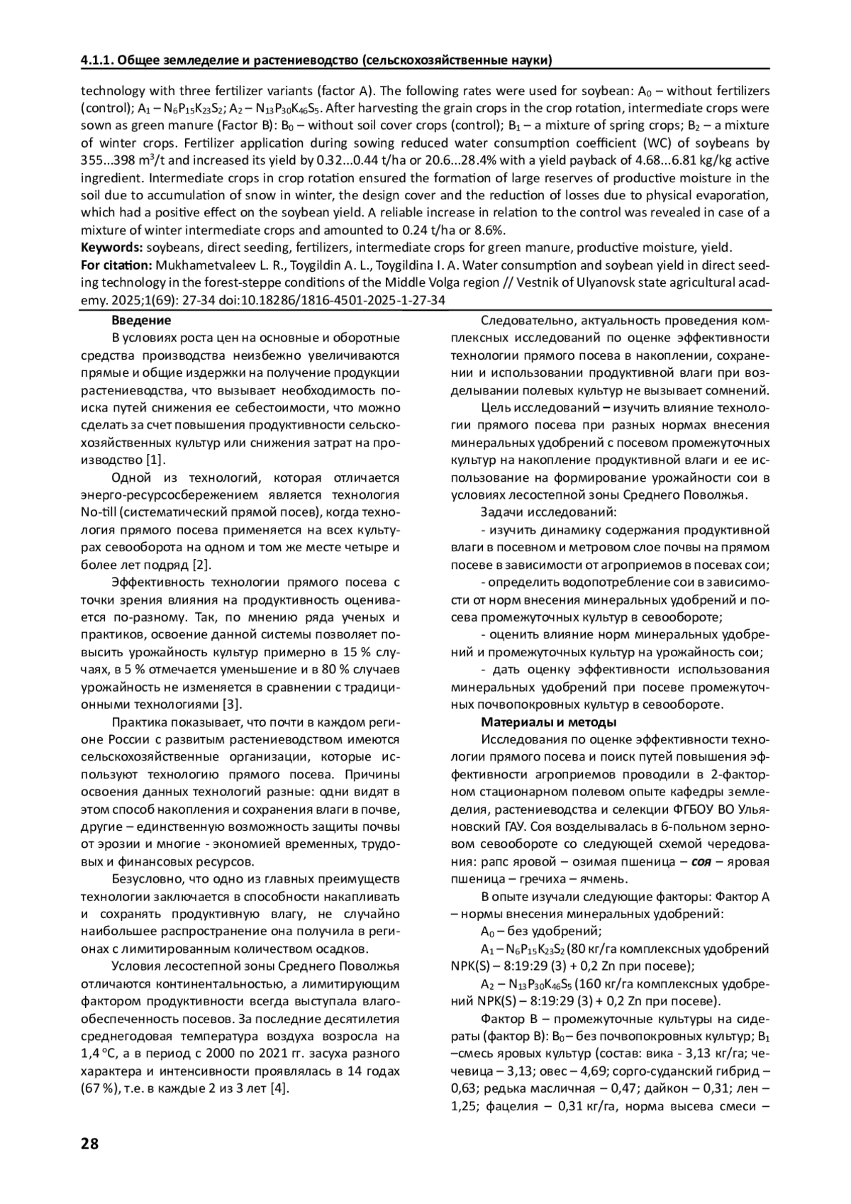В условиях производства все большее распространение получает технология прямого посева (No-till), которая призвана решить задачи по снижению себестоимости продукции, защиты почв от эрозии, и особенно она актуальна в условиях недостатка продуктивной влаги. Цель исследований: изучить влияние технологии прямого посева при разных нормах внесения минеральных удобрений и использования промежуточных культур на накопление продуктивной влаги и ее использование на формирование урожайности сои в условиях лесостепной зоны Среднего Поволжья. Исследования проводили на опытном поле в многофакторном полевом опыте, соя размещалась в севообороте: яровой рапс - озимая пшеница - соя - яровая пшеница - гречиха - ячмень. Все культуры возделывали по технологии прямого посева на трех вариантах удобрений (фактор А), под сою применяли следующие нормы: А0 - без удобрений (контроль); А1 - N6P15K23S2; А2 - N13P3oK46S5. После уборки зерновых культур в севообороте производился посев промежуточных культур на сидераты (Фактор В): В0 - без почвопокровных культур (контроль); В1 -смесь яровых культур; В2 - смесь озимых культур. Внесение удобрений при посеве снижали коэффициент водопотребления (Кв) сои на 355…398 м3/т и повышали ее урожайность на 0,32…0,44 т/га или 20,6.28,4 % с окупаемостью урожая 4,68.6,81 кг/кг д. в. Промежуточные культуры в севообороте обеспечили формирование больших запасов продуктивной влаги в почве благодаря накоплению снега в зимний период, проектного покрытия и снижения потерь на физическое испарение, что положительно сказалось на урожайности сои. Достоверная прибавка по отношению к контролю выявлена после смеси озимых промежуточных культур - 0,24 т/га или 8,6 %.