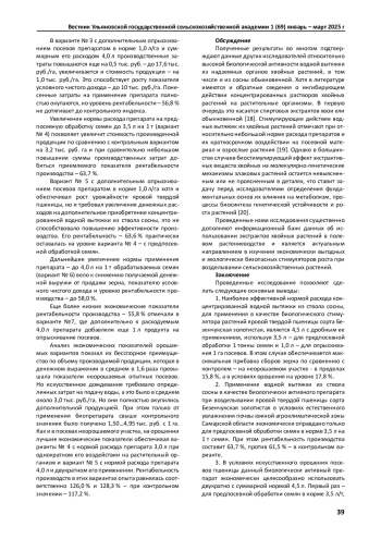 Исследования проводили с целью выявления возможности использования концентрированной водной вытяжки из ствола сосны в качестве биостимулятора яровой твердой пшеницы сорта Безенчукская золотистая. Полевые эксперименты проводились в течение 2022-2024 гг. в Самарской области. Опыт предусматривал три варианта норм использования препарата для предпосевной обработки семян: 3,0; 3,5; 4,0 л и три варианта норм: 4,0; 4,5; 5,0 л. для двукратного воздействия на растительный организм - обработки семян и опрыскивания вегетирующих растений. В контрольном варианте обработку семян и растений не проводили препаратом. Все варианты опыта размещали при естественном и искусственном орошении на удобренном фоне в норме: N40P40K40. Почва опытного поля - чернозем обыкновенный. Агротехника- общепринятая для яровой пшеницы, базирующаяся на безотвальной обработке пахотного горизонта. Погодные условия в годы исследований были характерными для южной агроклиматической зоны Самарского Заволжья. ГТК в период роста и развития опытных посевов в 2022 г. равнялся 0,53, а в 2023 и 2024 гг. соответственно 0,62 и 0,49. Орошение опытных посевов выполняли фронтальной дождевальной машиной BAUER OneAqua. Применение концентрированной водной вытяжки из ствола сосны при выращивании яровой твердой пшеницы позволяет влиять на продуктивность растений. При этом наиболее эффективной нормой расхода препарата является 4,5 л с дробным ее применением, используя 3,5 л - для предпосевной обработки 1 тонны семян и 1,0 л - для опрыскивания 1 га посевов. В этом случае обеспечивается прибавка урожая зерна на неорошаемом участке 15,8 %, а в условиях орошения - 17,8 % при полной экономической окупаемости производственных затрат.