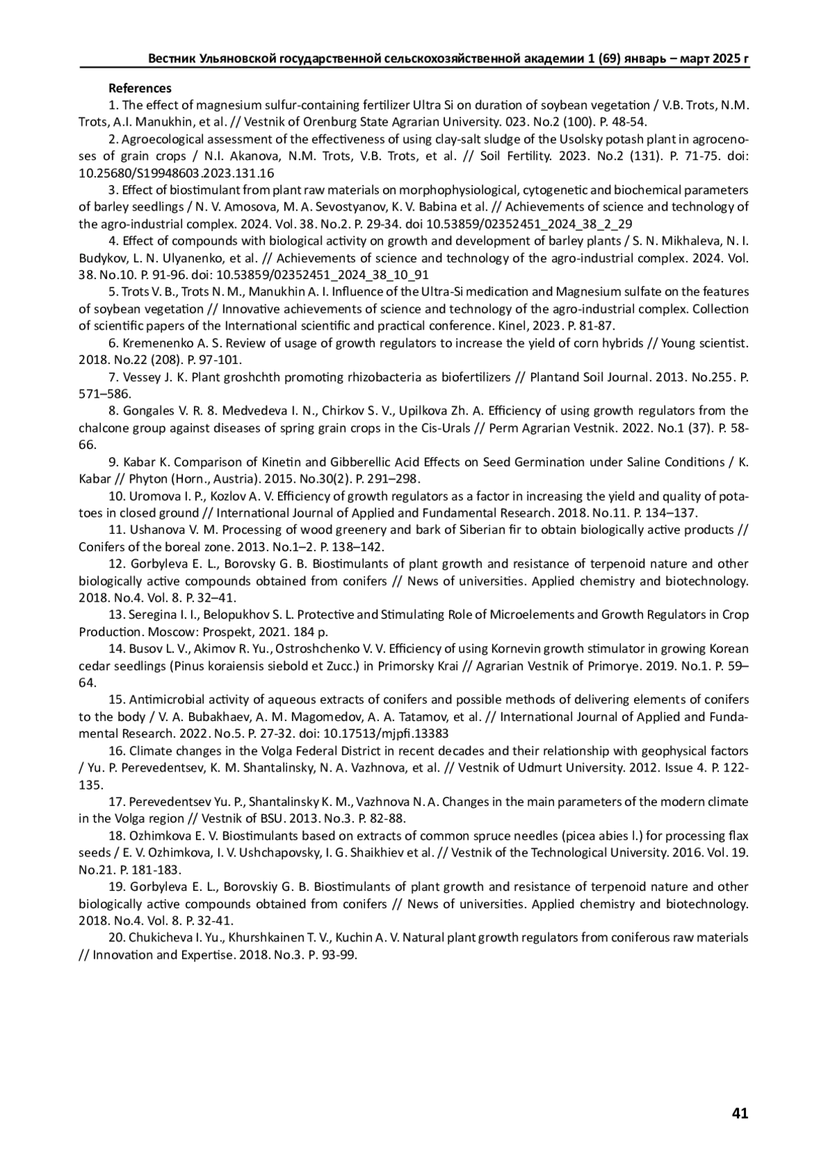 5. Троц В. Б., Троц Н. М., Манухин А. И. Влияние препарата “Ультра-Си” и Сульфата магния на особенности вегетации сои // Инновационные достижения науки и техники АПК. Сборник научных трудов Международной научно-практической конференции. Кинель, 2023. С. 81-87. EDN: VKHDRS