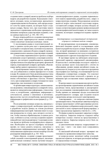 Статья посвящена исследованию разработки моделей словарей английского языка в современных лексикографических исследованиях. Рассматриваются основные этапы создания одноязычных и двуязычных справочников, изучается использование корпусных данных в процессе моделирования изданий. Выделяются сходства в процессе создания печатных и электронных словарей, такие как планирование справочника, определение потенциальной структуры, работа по проектированию мега-, макро- и микроструктуры изданий и др. Отличительной чертой моделирования электронного издания является подготовка особого программного обеспечения, на котором будут размещаться материалы словаря. В настоящее время уделяется особое внимание нуждам и потребностям пользователя. В рамках исследования потребностей потенциальной аудитории словарей лексикографы прибегают к использованию особого инструмента - анкетирования пользователей как подготовительного этапа в процессе создания словаря определенного типа. Анализ ответов аудитории на вопросы позволяет лексикографам сформулировать принципы организации мега-, макро- и микроструктуры издания, принимая во внимание потребности потенциального адресата. Отдельное место в лексикографических исследованиях принадлежит проведению ассоциативного эксперимента, результаты которого (дополнительная помета к лексическим единицам) могут быть непосредственно использованы лексикографами в процессе моделирования словарной статьи. Создание терминологических изданий приобретает отдельную популярность в практической лексикографии. Формируются новые отрасли знаний, что ведет к появлению новых терминов, которые необходимо включать в словари. Такие справочники традиционно публикуются в печатном варианте, однако в настоящее время появляется большое количество электронных специальных изданий, моделирование которых происходит с помощью различных лингвистических и математических методов.