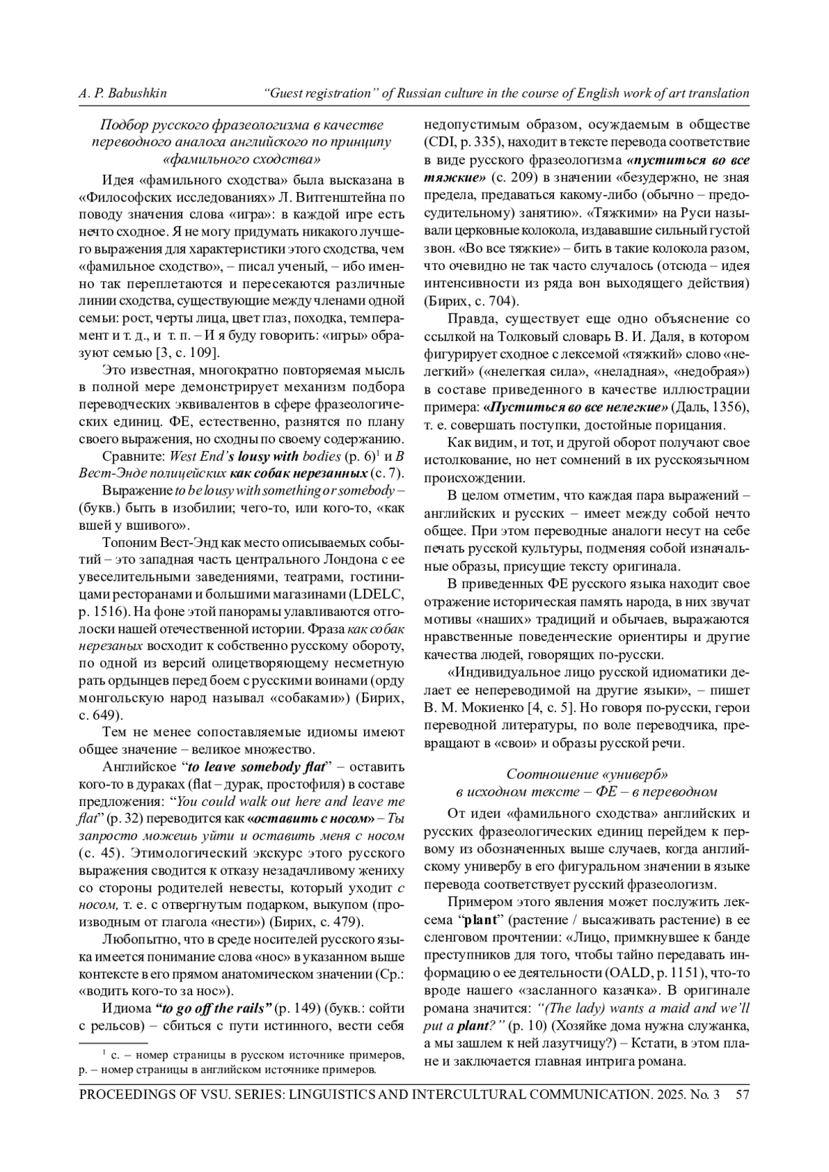 БАБУШКИН А. П. «ГОСТЕВАЯ ПРОПИСКА» РУССКОЙ КУЛЬТУРЫ В ПЕРЕВОДЕ АНГЛИЙСКОГО ХУДОЖЕСТВЕННОГО ТЕКСТА // ВЕСТНИК ВОРОНЕЖСКОГО ГОСУДАРСТВЕННОГО УНИВЕРСИТЕТА. СЕРИЯ: ЛИНГВИСТИКА И МЕЖКУЛЬТУРНАЯ КОММУНИКАЦИЯ. 2025. № 3