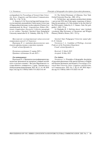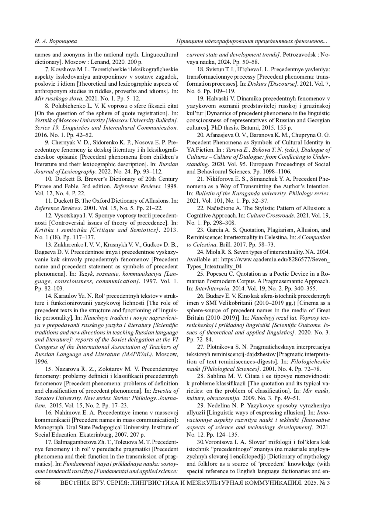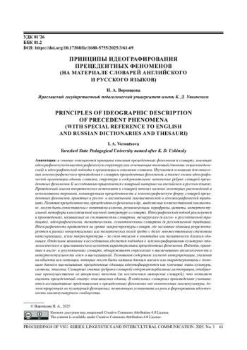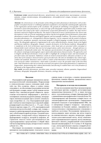 ВОРОНЦОВА И. А. ПРИНЦИПЫ ИДЕОГРАФИРОВАНИЯ ПРЕЦЕДЕНТНЫХ ФЕНОМЕНОВ (НА МАТЕРИАЛЕ СЛОВАРЕЙ АНГЛИЙСКОГО И РУССКОГО ЯЗЫКОВ) // ВЕСТНИК ВОРОНЕЖСКОГО ГОСУДАРСТВЕННОГО УНИВЕРСИТЕТА. СЕРИЯ: ЛИНГВИСТИКА И МЕЖКУЛЬТУРНАЯ КОММУНИКАЦИЯ. 2025. № 3