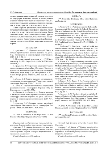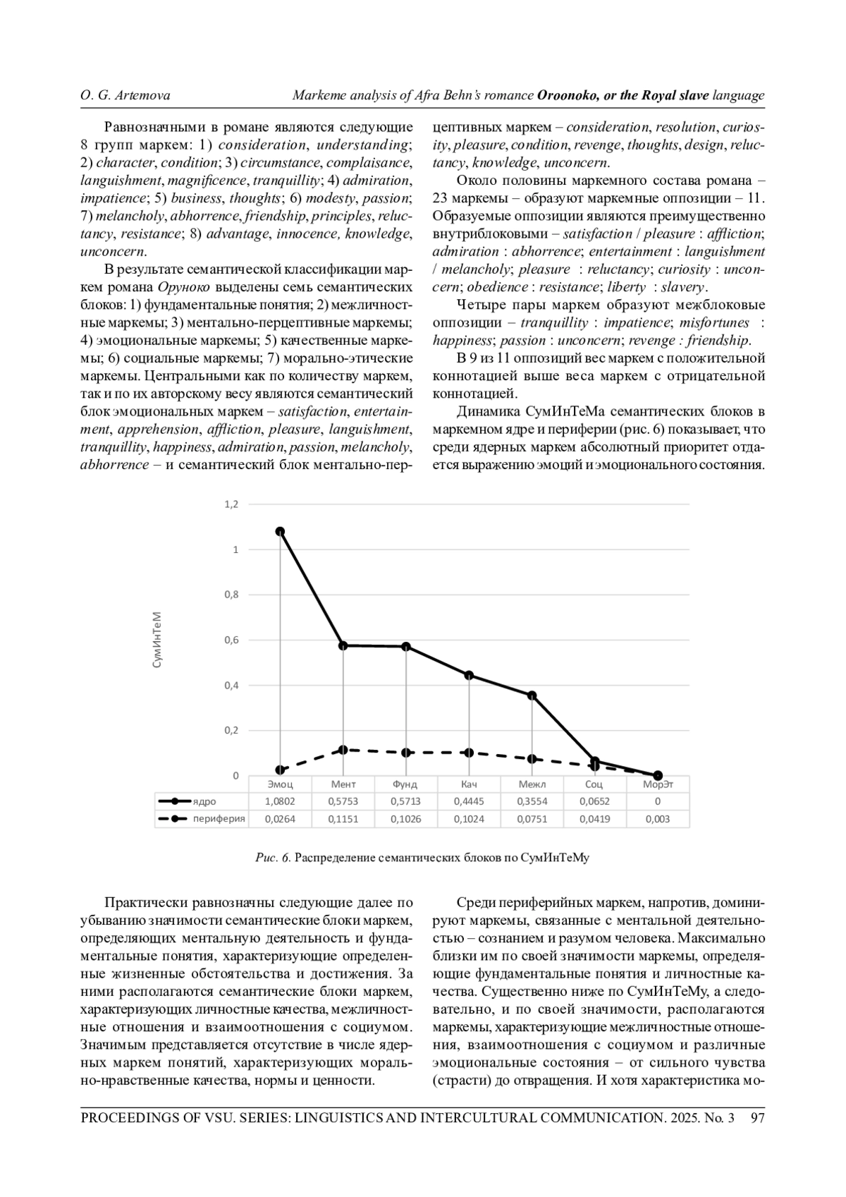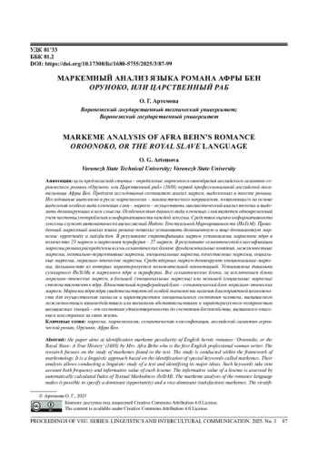 АРТЕМОВА О. Г. МАРКЕМНЫЙ АНАЛИЗ ЯЗЫКА РОМАНА АФРЫ БЕН ОРУНОКО, ИЛИ ЦАРСТВЕННЫЙ РАБ // ВЕСТНИК ВОРОНЕЖСКОГО ГОСУДАРСТВЕННОГО УНИВЕРСИТЕТА. СЕРИЯ: ЛИНГВИСТИКА И МЕЖКУЛЬТУРНАЯ КОММУНИКАЦИЯ. 2025. № 3