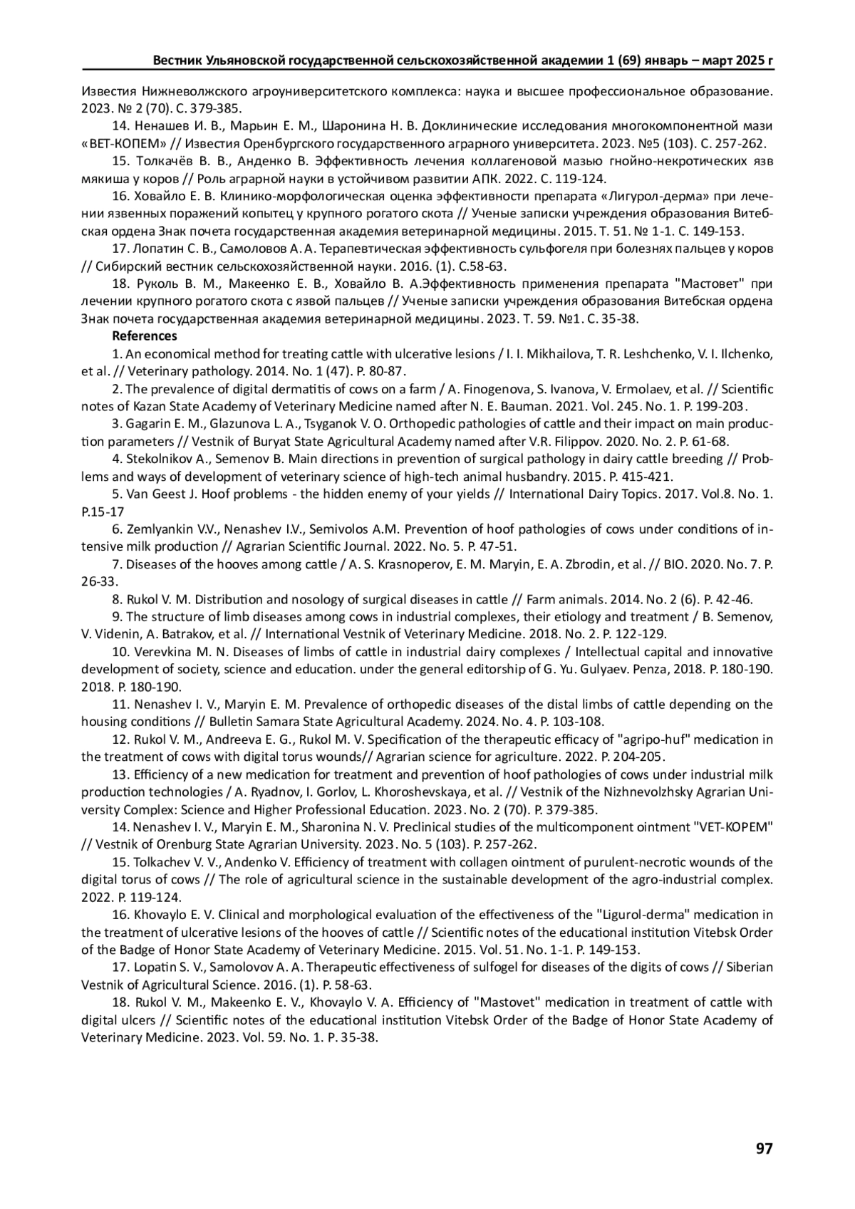 НЕНАШЕВ И. В., МАРЬИН Е. М. ТЕРАПЕВТИЧЕСКАЯ ЭФФЕКТИВНОСТЬ МАЗЕЙ ПРИ ЛЕЧЕНИИ ЯЗВЫ МЯКИША У ДОЙНЫХ КОРОВ // ВЕСТНИК УЛЬЯНОВСКОЙ ГОСУДАРСТВЕННОЙ СЕЛЬСКОХОЗЯЙСТВЕННОЙ АКАДЕМИИ. 2025. № 1 (69)