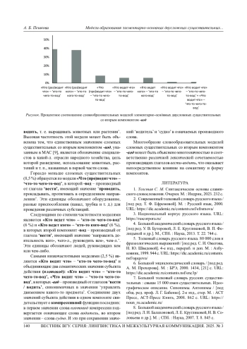 В данной статье выявлены и описаны основные словообразовательные модели элементарно-основных двусложных существительных со вторым компонентом -вод, предназначенные для компьютерного моделирования сложных слов русского языка. Анализируемые единицы являются производными от предложений с глагольными словосочетаниями с зависимым существительным в Винительном падеже или в функции прямого объекта. Субъект действия не имеет формального выражения в структуре сложного слова, только в словарных дефинициях. На значение и форму рассматриваемых композитов влияет семантика и лексическая сочетаемость глагола вести-водить. Второй компонент -вод чаще всего (77 %) является производным от глагола водить с значением ‘(раз)водить, выращивать животных или растения’, реже (12 и 8,5 % соответственно) - вести, имеющим значение ‘руководить кем-либо, чем-либо ’или ‘(про)водить в некотором направлении ’, совсем редко (2,5 %) - вести/водить, синонимичных в значении ‘управлять движением какого-то предмета ’. В первой группе композиты образуются по моделям «Кто (раз)водит что» - ‘кто-то чего-то-вод’ и «Кто (раз)водит кого» - ‘кто-то кого-то-вод’. Во второй группе - «Кто ведет что» > ‘кто-то чего-то-вод ’ и «Кто ведет кого» - ‘кто-то кого-вод ’, а также «Что (про)водит что» - ‘что-то чего-то-вод’. Сложные существительные третьей группы образуются по модели «Кто водит что» - ‘кто-чего-вод’, «Что водит что» - ‘что-чего-вод’. Многообразие словообразовательных моделей сложных существительных со вторым компонентом -вод может быть объяснено многозначностью и соответственно различной лексической сочетаемостью производящих глаголов вести-водить, что оказывает непосредственное влияние на внешнюю и внутреннюю форму композитов.