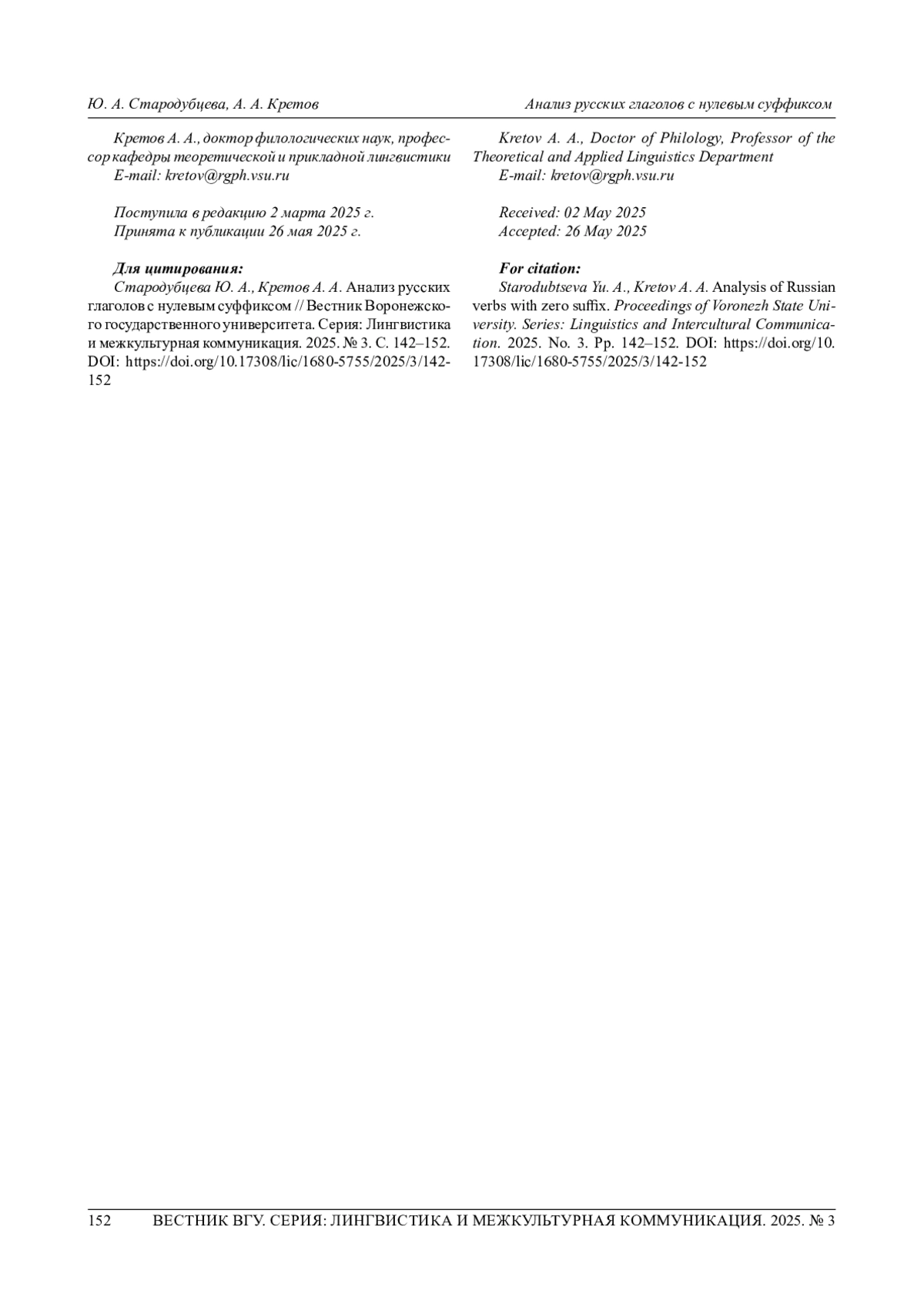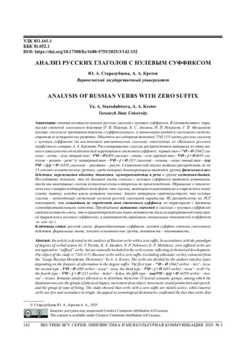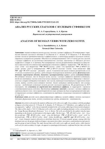 КРЕТОВ А. А., СТАРОДУБЦЕВА Ю. А. АНАЛИЗ РУССКИХ ГЛАГОЛОВ С НУЛЕВЫМ СУФФИКСОМ // ВЕСТНИК ВОРОНЕЖСКОГО ГОСУДАРСТВЕННОГО УНИВЕРСИТЕТА. СЕРИЯ: ЛИНГВИСТИКА И МЕЖКУЛЬТУРНАЯ КОММУНИКАЦИЯ. 2025. № 3