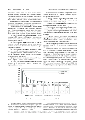 Статья посвящена анализу русских глаголов с нулевым суффиксом. В соответствии с парадигмой степеней глагольного действия (Г. В. Павский, К. С. Аксаков, Н. П. Некрасов, Г. П. Мельников) нулевые глаголы не противопоставлены «суффиксальным», а закономерно входят в глагольную систему, отражая ее историческое развитие. Объектом исследования являются 7243 (1/5 часть) русских глаголов с нулевым суффиксом (за исключением атематических глаголов), извлеченные из «Большого русского морфемного словаря» А. А. Кретова. Рассматриваемые глаголы распределяются авторами по пяти типам в зависимости от особенностей чередования в степенном суффиксе: первый тип - (e) Ø - Ø (1642 глагола) - лезть - лезу; второй тип - Va Ø - Ø (493 глагола) - сеять - сею; третий тип - Va Ø - j + Ø (635 глаголов) - резать - режз=j у; четвертый тип - Vo Ø - j + Ø (115 глаголов) - колоть - колю; пятый тип - (ов) Va Ø - (у)j + Ø (4358 глаголов) - рисовать - рисую. Семантический анализ позволил распределить их по 13 лексико-семантическим группам, среди которых доминирующими являются группы физического воздействия, перемещения объекта, движения, звукопроизводства и речи и группа состояния-бытия. Исследование показало, что по большей части глаголы с нулевым суффиксом являются активными, тогда как инактивные глаголы немногочисленны и вторичны по происхождению. Обращение к этимологическим словарям подтвердило тот факт, что глаголы, являющиеся инактивными в современном языке (гнить, таять), исходно имели активное значение. Анализ материала свидетельствует, что нулевые глаголы - необходимый системный элемент русской глагольной парадигмы. Их распределение по ЛСГ показывает, что семантика не определяет тип степенного суффикса, но коррелирует с древними словообразовательными моделями. Преобладание активных значений в глаголах с нулевым суффиксом свидетельствует о том, что в праиндоевропейском языке активность была немаркированной категорией (выражалась нулевым суффиксом), а инактивность требовала специальных показателей (суффиксов -ѣ- или -ну-)
