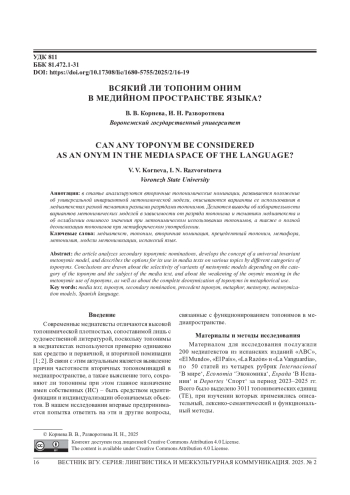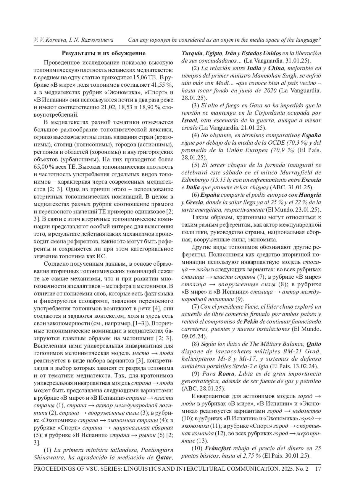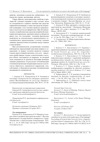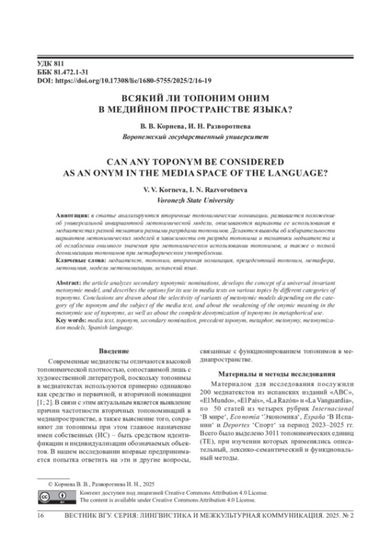КОРНЕВА В. В., РАЗВОРОТНЕВА И.Н. ВСЯКИЙ ЛИ ТОПОНИМ ОНИМ В МЕДИЙНОМ ПРОСТРАНСТВЕ ЯЗЫКА? // ВЕСТНИК ВОРОНЕЖСКОГО ГОСУДАРСТВЕННОГО УНИВЕРСИТЕТА. СЕРИЯ: ЛИНГВИСТИКА И МЕЖКУЛЬТУРНАЯ КОММУНИКАЦИЯ. 2025. № 2