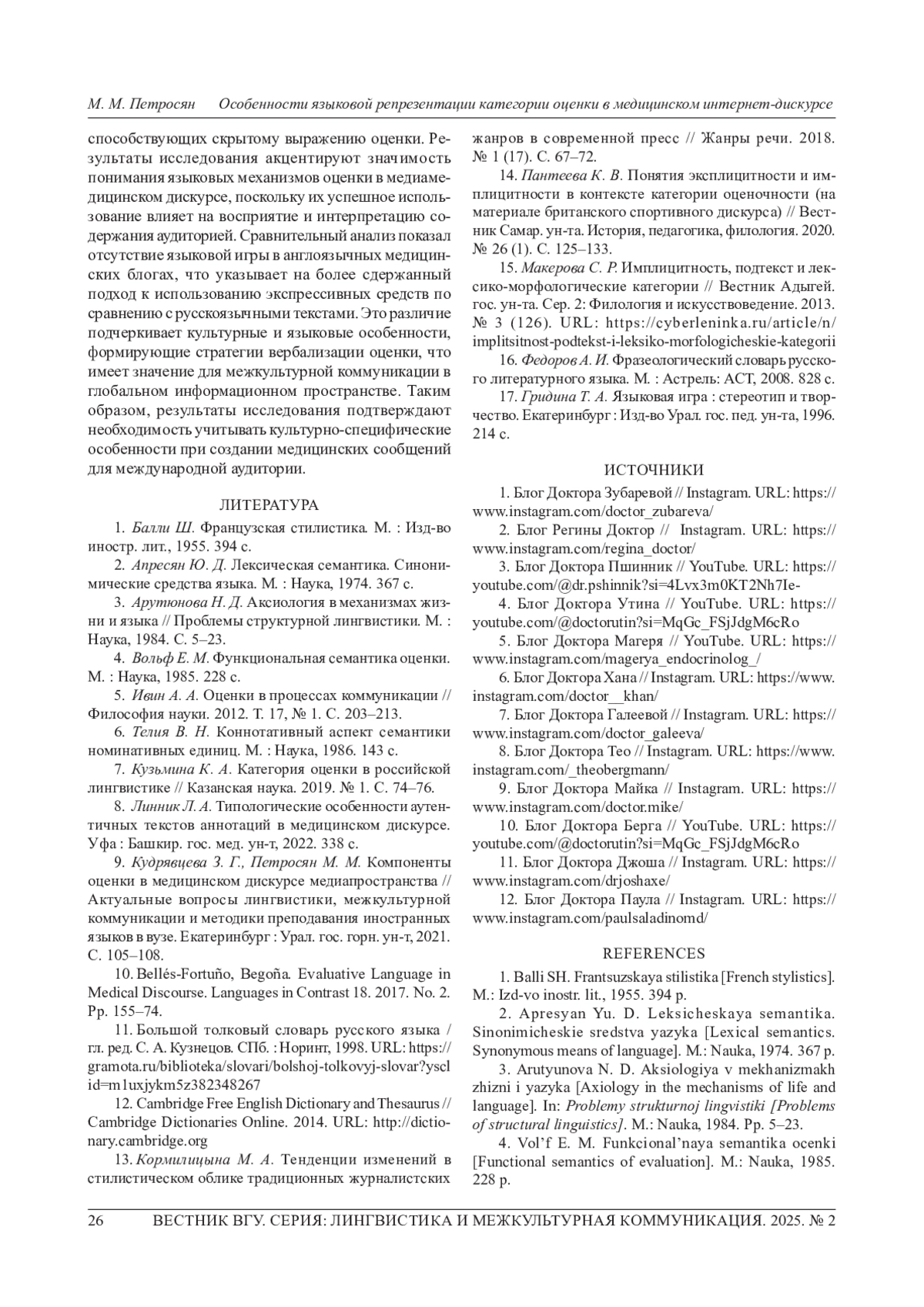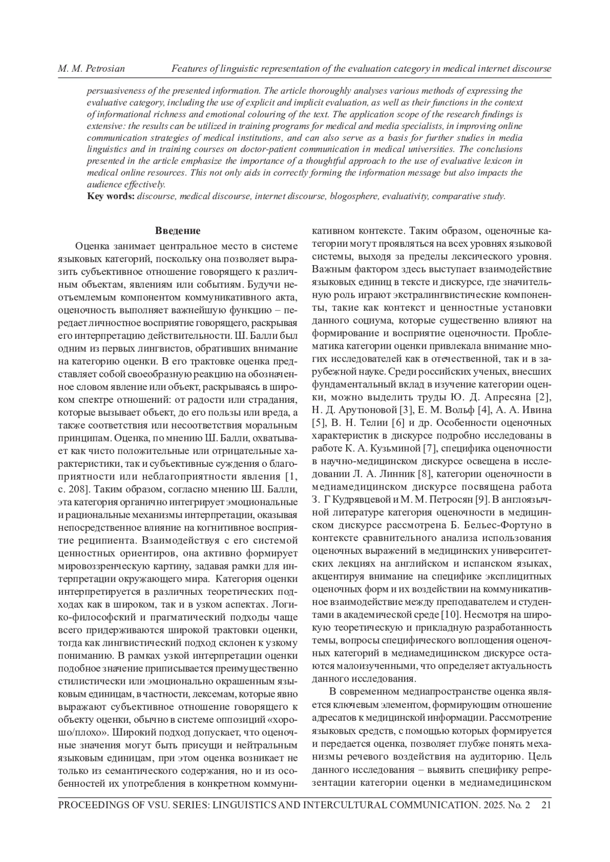 9. Кудрявцева З. Г., Петросян М. М. Компоненты оценки в медицинском дискурсе медиапространства // Актуальные вопросы лингвистики, межкультурной коммуникации и методики преподавания иностранных языков в вузе. Екатеринбург: Урал. гос. горн. ун-т, 2021. С. 105-108. EDN: ANSSYE