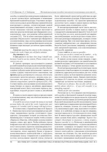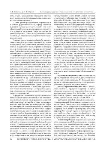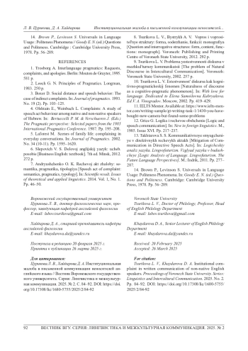 ХАЙДАРОВА Д. А., ЦУРИКОВА Л. В. ИНСТИТУЦИОНАЛЬНАЯ ЖАЛОБА В ПИСЬМЕННОЙ КОММУНИКАЦИИ НЕНОСИТЕЛЕЙ АНГЛИЙСКОГО ЯЗЫКА // ВЕСТНИК ВОРОНЕЖСКОГО ГОСУДАРСТВЕННОГО УНИВЕРСИТЕТА. СЕРИЯ: ЛИНГВИСТИКА И МЕЖКУЛЬТУРНАЯ КОММУНИКАЦИЯ. 2025. № 2