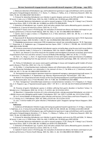 1. Incidences of Helicobacter infection in pigs and tracing occupational hazard in pig farmers / S. R. Pegu, J. Sonowal,S.Rajkhowa et al. // Comp Immunol Microbiol Infect Dis. 2024. № 106. 102128. DOI: 10.1016/j.cimid.2024.102128 EDN: AAZDBM