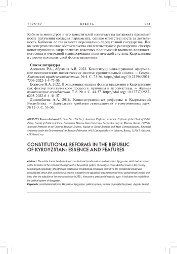 В статье прослеживается динамика конституционных реформ в Кыргызстане, оказавших воздействие на формирование институциональной составляющей политический системы. В ходе проведенного анализа делается вывод, что власть в стране неоднократно менялась зачастую в ходе нарушений конституционных предписаний; вплоть до 2010 г. закреплялась президентская модель, которая после конституционных преобразований, инициированных оппозицией, трансформировалась в парламентскую, а затем, после принятия новой конституции 2021 г., снова стала президентской республикой, что свидетельствует о нестабильности политической системы Киргизии.