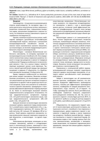 15. Стрельцов В. А., Рябичева А. Е., Голуб Т. В.Продуктивность дочерей, полученных от свиноматок с различным уровнем многоплодия // Известия Оренбургского государственного аграрного университета. 2021. № 1(87). С. 288-291. EDN: WEBBFY