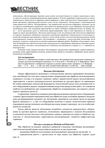 Темой исследования является оценка эффективности включения в технологические цепочки обработки большегрузных контейнеров специализированного перегрузочного оборудования для обработки подвижного состава железнодорожного транспорта в тыловой зоне морского терминала и в ходе погрузки судна насыпными грузами. Отмечается, что постановка задачи требует сравнительной оценки эксплуатационных характеристик и предварительных расчетов производительности погрузочно-разгрузочных машин на грузовом фронте их использования. Технологический процесс по обработке удобрений в большегрузных контейнерах предложено рассматривать как две отличающиеся по ритму работ подсистемы, обеспечивающие передачу груза между железной дорогой и складом накопления и подачу груза на погрузку внутритерминальным транспортом. В целях выработки предложений по поиску оптимального применения на фронтах работ выбранного типа перегрузочного оборудования может быть произведен сравнительный анализа «узких мест» терминала, обозначенных в представленной математической модели. Подчеркивается, что приведенная технология обработки насыпных грузов на морском контейнерном терминале отличается от традиционной схемы обработки большегрузных контейнеров тем, что контейнер применяется на этапе доставки удобрений только до борта судна — после высыпания груза он подлежит транспортировке через склад терминала до пункта затарки на завод-производитель. Поскольку выделенные в ходе исследования две подсистемы обработки на морском терминале удобрений в насыпных контейнерах требуют создания разного количества каналов обслуживания грузопотоков, в данном случае имеет место классический пример решения задачи многоканальной системы массового обслуживания с ожиданием с целью расчета количества мест выгрузки, погрузки и перегрузки на каждом выявленном фронте работ. В работе сделан вывод о том, что достоверность оценки возможностей перегрузочного оборудования терминала позволит организовать систему массового обслуживания без ожидания обслуживания в очереди, т. е. с заданной интенсивностью.