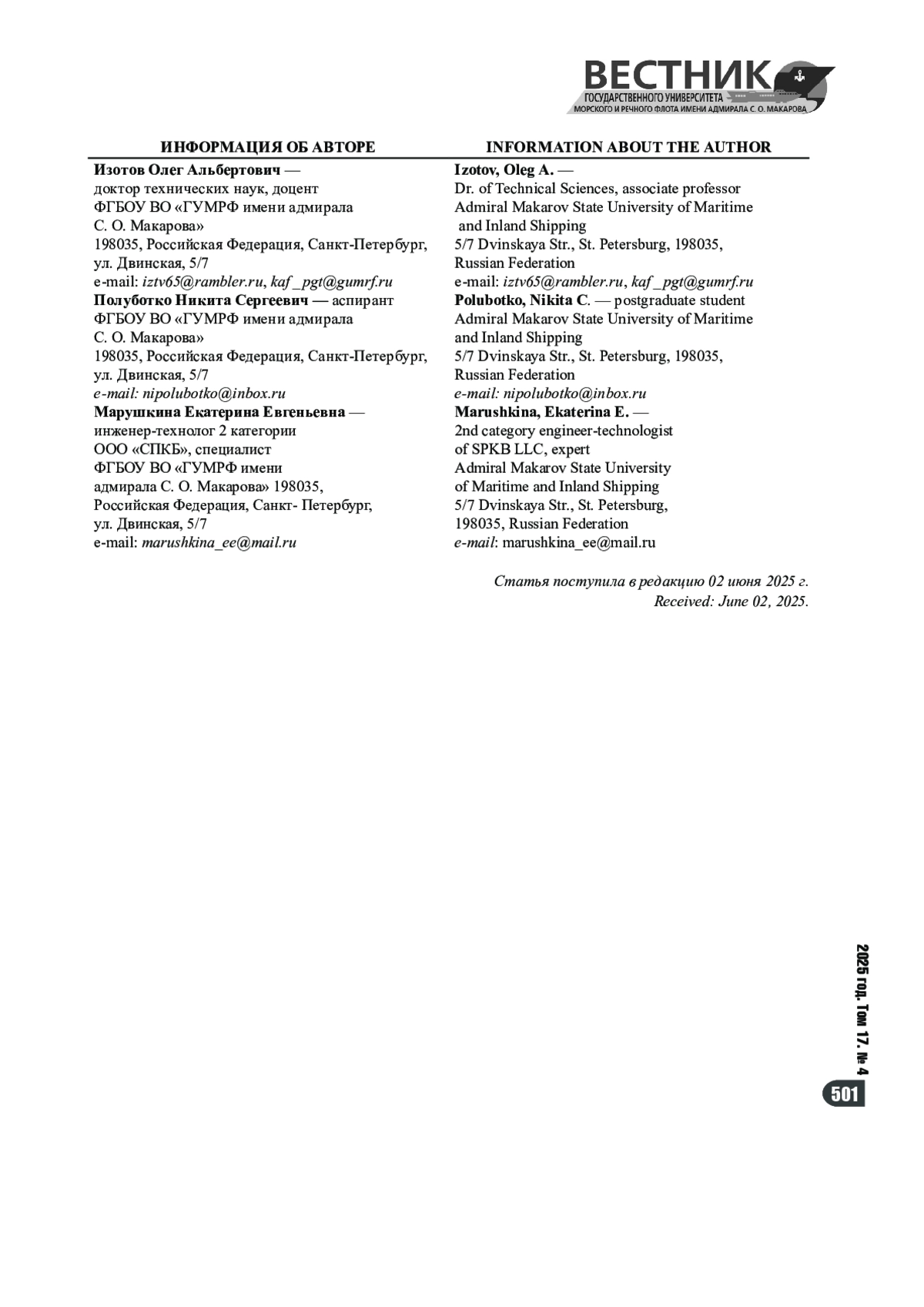 1. Изотов О. А. Обоснование возможности обработки контейнеризированных навалочных грузов на морском терминале / О. А. Изотов, Н. С. Полуботко // Вестник государственного университета морского и речного флота имени адмирала С. О. Макарова. - 2025. - Т. 17. - № 2. - С. 208-215. https://doi.org/10.21821/23095180-2025-17-2-208-215. - EDN HRYNBC.