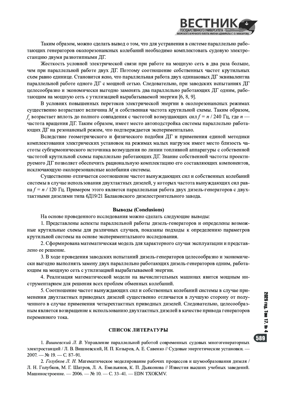 1. Вишневский Л. В. Управление параллельной работой современных судовых многогенераторных электростанций / Л. В. Вишневский, И. П. Козырев, А. Е. Савенко // Судовые энергетические установки. - 2007. - № 19. - С. 87-91.