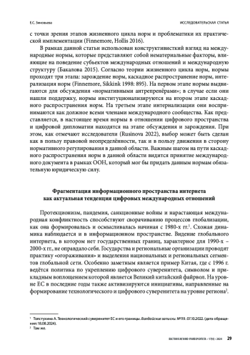 Методологически статья построена на теории жизненного цикла норм. Согласно данному подходу нормы представляют собой социальные стандарты, регулирующие поведение государств в определенной области международных отношений. Была исследована эволюция дискурса о нормах, регулирующих цифровую дипломатию и глобальное цифровое пространство. В настоящее время, произошёл отказ продвигаемых США норм глобального интернета, свободного от государственных границ. Сформировался набор норм в области ответственного поведения государств в ИКТ-среде, закреплённых в документах ООН, региональных организаций и иных международных форумов. Однако, направления их развития и практического применения остаются предметом межгосударственных дискуссии, ввиду высокой значимости данной проблемы и различий в интересах и подходах государств.
