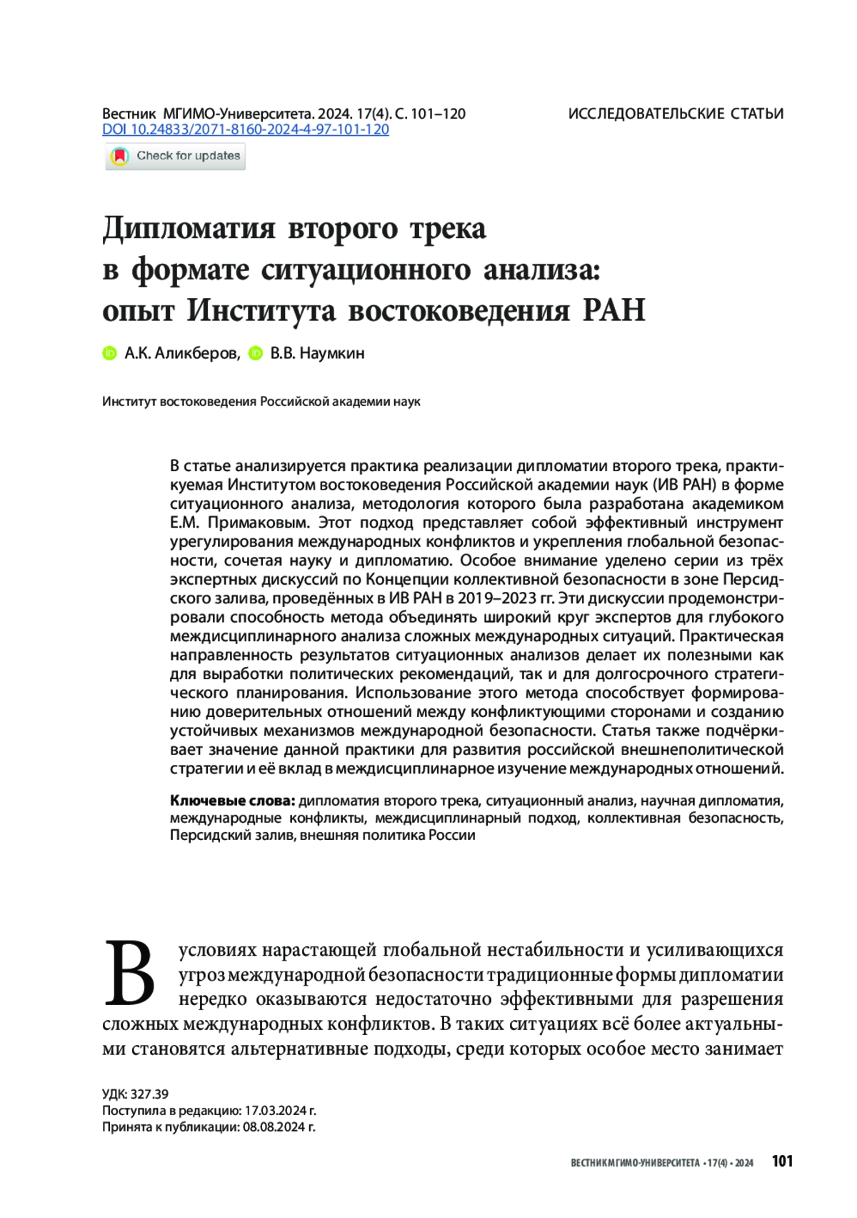 В статье анализируется практика реализации дипломатии второго трека, практикуемая Институтом востоковедения Российской академии наук (ИВ РАН) в форме ситуационного анализа, методология которого была разработана академиком Е. М. Примаковым. Этот подход представляет собой эффективный инструмент урегулирования международных конфликтов и укрепления глобальной безопасности, сочетая науку и дипломатию. Особое внимание уделено серии из трёх экспертных дискуссий по Концепции коллективной безопасности в зоне Персидского залива, проведённых в ИВ РАН в 2019–2023 гг. Эти дискуссии продемонстрировали способность метода объединять широкий круг экспертов для глубокого междисциплинарного анализа сложных международных ситуаций. Практическая направленность результатов ситуационных анализов делает их полезными как для выработки политических рекомендаций, так и для долгосрочного стратегического планирования. Использование этого метода способствует формированию доверительных отношений между конфликтующими сторонами и созданию устойчивых механизмов международной безопасности. Статья также подчёркивает значение данной практики для развития российской внешнеполитической стратегии и её вклад в междисциплинарное изучение международных отношений.
