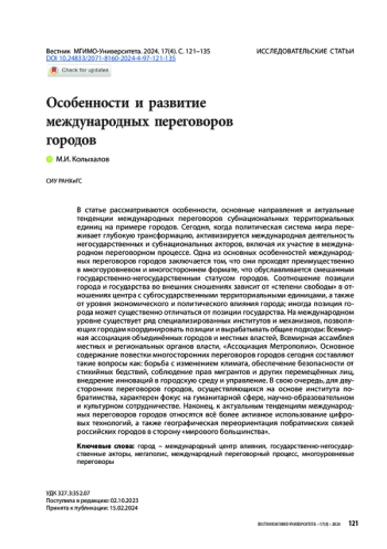 В статье рассматриваются особенности, основные направления и актуальные тенденции международных переговоров субнациональных территориальных единиц на примере городов. Сегодня, когда политическая система мира переживает глубокую трансформацию, активизируется международная деятельность негосударственных и субнациональных акторов, включая их участие в международном переговорном процессе. Одна из основных особенностей международных переговоров городов заключается том, что они проходят преимущественно в многоуровневом и многостороннем формате, что обуславливается смешанным государственно-негосударственным статусом городов. Соотношение позиции города и государства во внешних сношениях зависит от «степени свободы» в отношениях центра с субгосударственными территориальными единицами, а также от уровня экономического и политического влияния города; иногда позиция города может существенно отличаться от позиции государства. На международном уровне существует ряд специализированных институтов и механизмов, позволяющих городам координировать позиции и вырабатывать общие подходы: Всемирная ассоциация объединенных городов и местных властей, Всемирная ассамблея местных и региональных органов власти, «Ассоциация Метрополио». Основное содержание повестки многосторонних переговоров городов сегодня составляют такие вопросы как: борьба с изменением климата, обеспечение безопасности от стихийных бедствий, соблюдение прав мигрантов и других перемещенных лиц, внедрение инноваций в городскую среду и управление. В свою очередь, для двухсторонних переговоров городов, осуществляющихся на основе института побратимства, характерен фокус на гуманитарной сфере, научно-образовательном и культурном сотрудничестве. Наконец, к актуальным тенденциям международных переговоров городов относятся всё более активное использование цифровых технологий, а также географическая переориентация побратимских связей российских городов в сторону «мирового большинства».