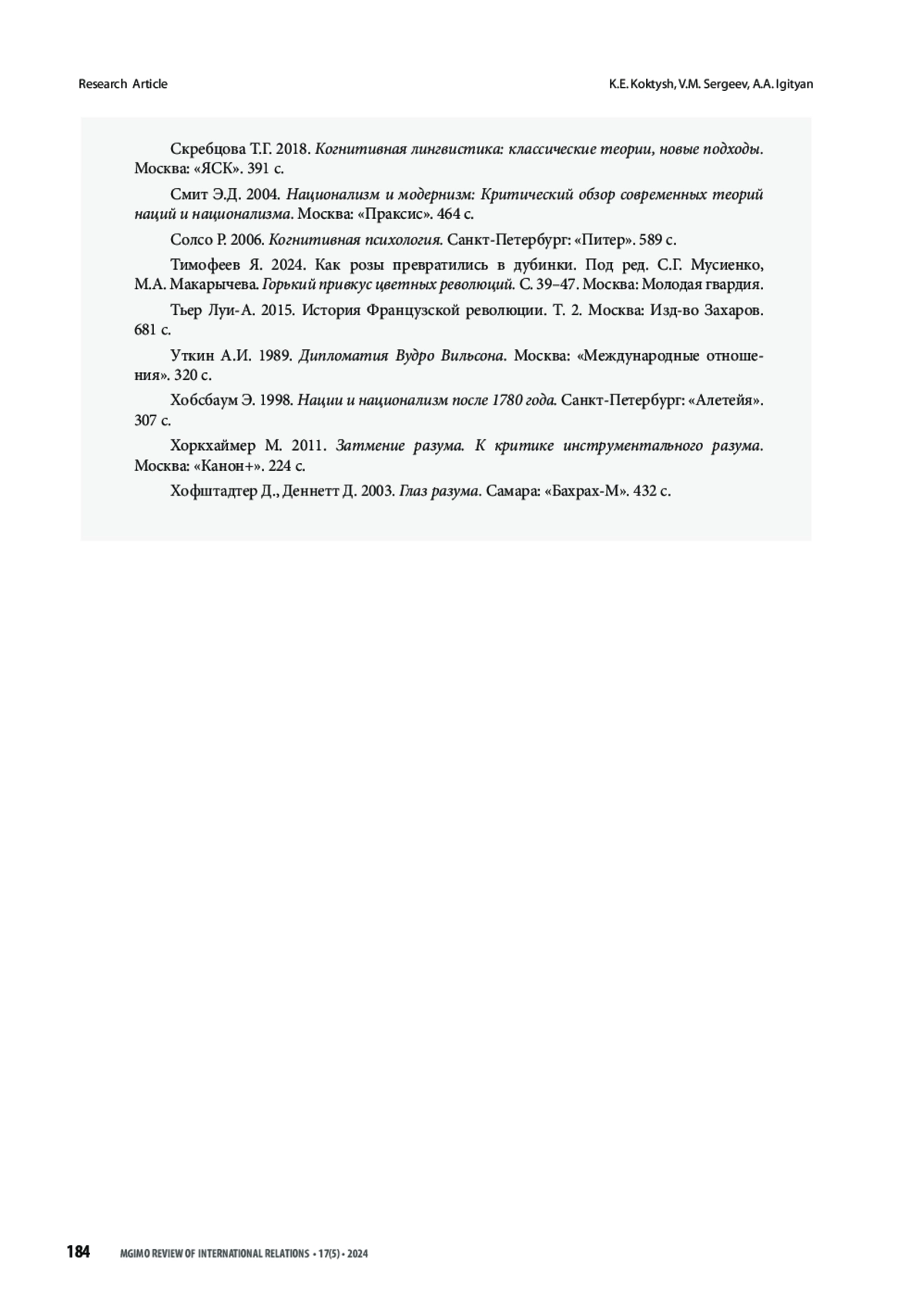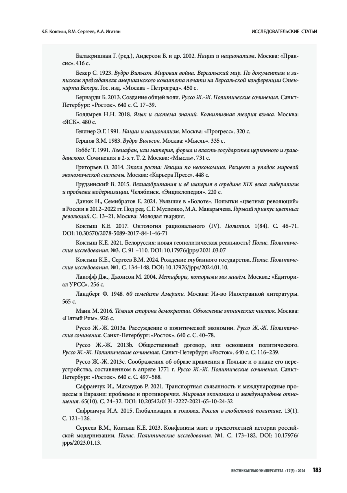 43. Сергеев В.М., Коктыш К.Е. 2023. Конфликты элит в трехсотлетней истории российской модернизации. Полис. Политические исследования. №1. С. 173-182. https://doi.org/10.17976/ jpps/2023.01.13.