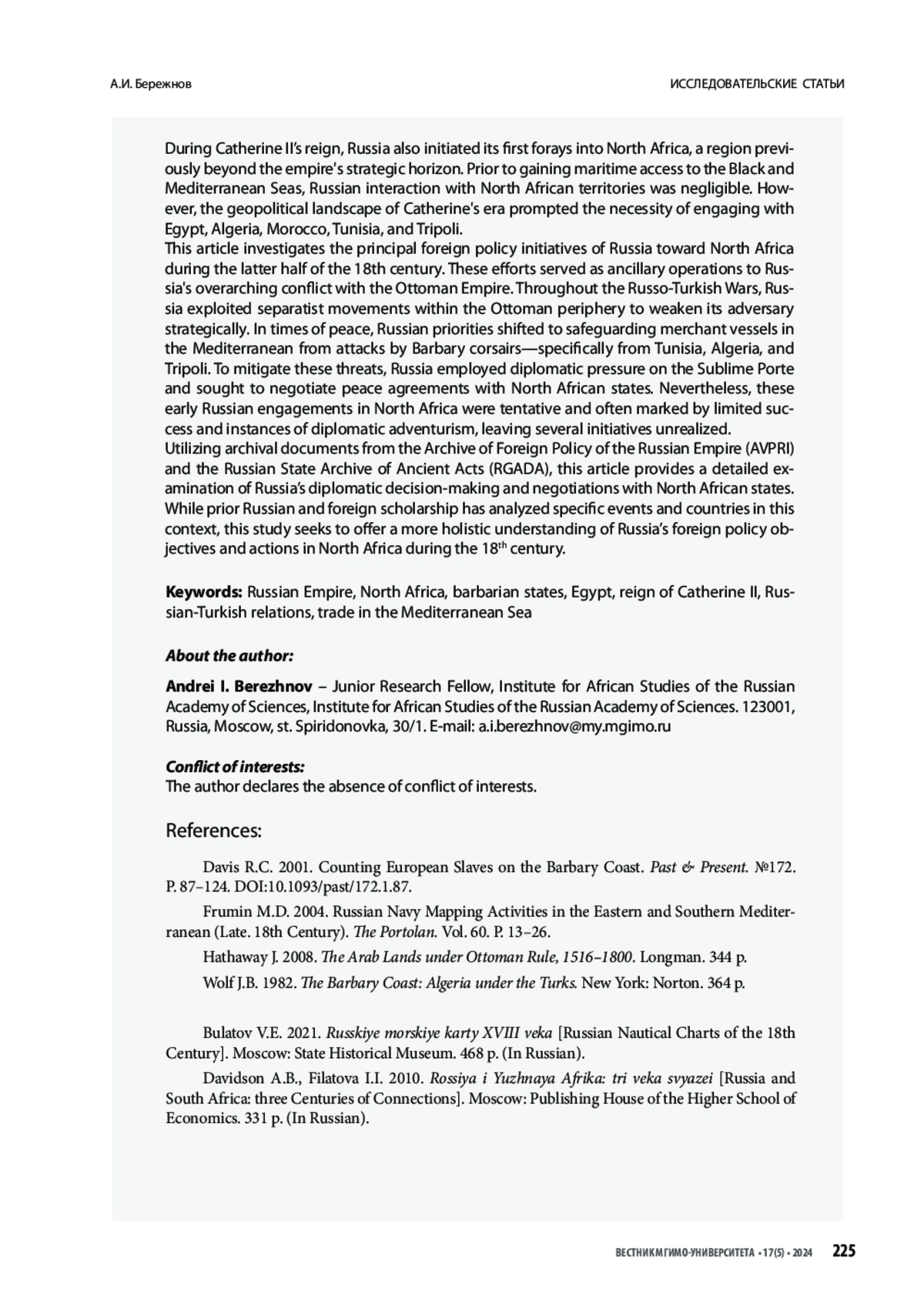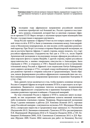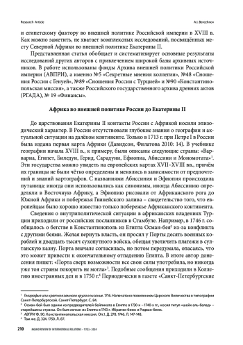 XVIII в. во многих отношениях определил судьбу Российской империи. В стране созревали внутренние предпосылки для модернизации, были достигнуты серьёзные внешнеполитические успехи. Пётр I «прорубил окно» в Европу, а Екатерина II решила задачу открытия для России Чёрного моря. Последнее не только позволило перенести центр земледелия России в южные плодородные земли, но и открыло путь к новым международным морским путям. Геополитические возможности страны заметно расширились. Оказалась «приоткрытой» даже дверь в Африку. До получения выхода в Чёрное и Средиземное моря контактов у России со странами Северной Африки практически не существовало. Именно в екатерининскую эпоху возникла возможность российского взаимодействия с Египтом, Алжиром, Марокко, Тунисом и Триполи. В данной статье исследуются внешнеполитические инициативы России в Северной Африке в царствование Екатерины II. Российская деятельность на этом континенте дополняла усилия на главном для внешней политики Российской империи во второй половине XVIII в. горизонте противоборства с Турцией. Используя сепаратистские движения на окраинах Османской империи, Россия добивалась ослабления и отвлечения сил своего противника во время русско-турецких войн. В мирное время Россия стремилась обеспечить безопасность своих торговых судов. Во второй половине XVIII – начале XIX вв. российская торговля в Средиземном море страдала от нападения корсаров варварийских государств, а именно Туниса, Алжира и Триполи. Для разрешения этой проблемы Россия оказывала давление на Порту, а также пыталась заключить мирные договоры с государствами Северной Африки. Первые шаги России на Африканском континенте были очень скромными, не лишёнными авантюризма, и далеко не все планы удалось реализовать. Статья написана на базе документов из Архива внешней политики Российской империи (АВПРИ) и Российского государственного архива древних актов (РГАДА), которые позволяют понять, как принимались решения и велись переговоры со странами Северной Африки. Некоторые аспекты первых российско-африканских контактов рассматривались в российской и зарубежной исторической литературе, но большее внимание уделялось отдельным сюжетам и странам. В данной статье предпринята попытка всестороннего обозрения причин и содержания внешней политики России XVIII столетия в отношении Северной Африки.