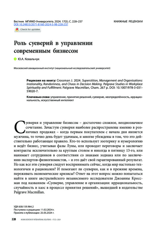 Рецензия на книгу: Crossman J. 2024. Superstition, Management and Organisations: Irrationality, Randomness, and Chaos in Decision Making. Palgrave Studies in Workplace Spirituality and Fulfillment. Palgrave Macmillan, Cham. 267 р. DOI: 10.1007/978-3-031- 59020-7.