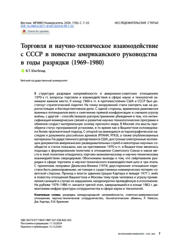 В структуре разрядки напряжённости в американо-советских отношениях 1970-х гг. вопросы торговли и взаимодействия в сфере науки и технологий занимали важное место. К концу 1960-х гг. в противостоянии США и СССР был достигнут стратегический паритет. На гонку вооружений стали смотреть как на дорогостоящее и бесперспективное дело. С одной стороны, временное равновесие военных потенциалов вело к смягчению прямой конфронтации и снижало угрозу войны, с другой – способствовало распространению убеждения в том, что интенсификация коммерческих связей и развитие научно-технологических программ и обменов создаст материальную основу прочного мира. В Москве эта мысль приобрела статус программной установки, в то время как в Вашингтоне исповедовали более прагматичный подход. С опорой на имеющееся историографическое наследие и документы российских архивов (РГАНИ, РГАЭ), а также опубликованные материалы государственного департамента США, доступные электронные коллекции документов американских разведывательных служб и некоторых научных сообществ в статье показано, как на протяжении 1970-х гг. в Вашингтоне менялись подходы к формированию политики в отношении Советского Союза и какое место в этой политике отводилось торгово-экономическому и научно-техническому взаимодействию сверхдержав. Обоснованы выводы о том, что свёртывание разрядки в сфере торговли и научно-технического взаимодействия шло в три этапа. С принятием поправки Джексона-Вэника (1974) двусторонние отношения перестали быть равноправными, не говоря о существенных коммерческих потерях советской стороны. Приход к власти администрации Картера в январе 1977 г. внёс в повестку отношений Вашингтона и Москвы тему прав человека и угрозу применения санкций в случае их нарушения, неоднократно приведённую в исполнение. На рубеже 1979–1980 гг. начался третий этап, завершивший в конце 1982 г. демонтажем инфраструктуры сотрудничества в сфере науки и технологий.