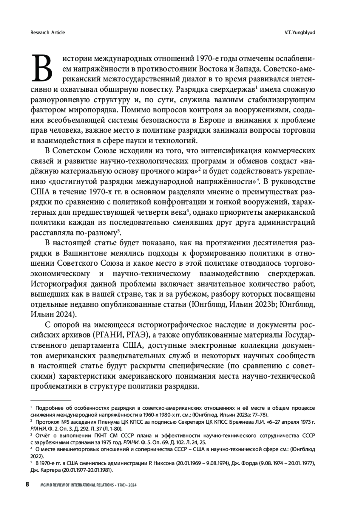 36. Юнгблюд В.Т., Ильин Д.В. 2024. Торгово-экономические и научно-технические связи США и СССР в годы разрядки. Мировая экономика и международные отношения. Т. 68. № 5. С. 125-141. https://doi.org/10.20542/0131-2227-2024-68-5-125-141