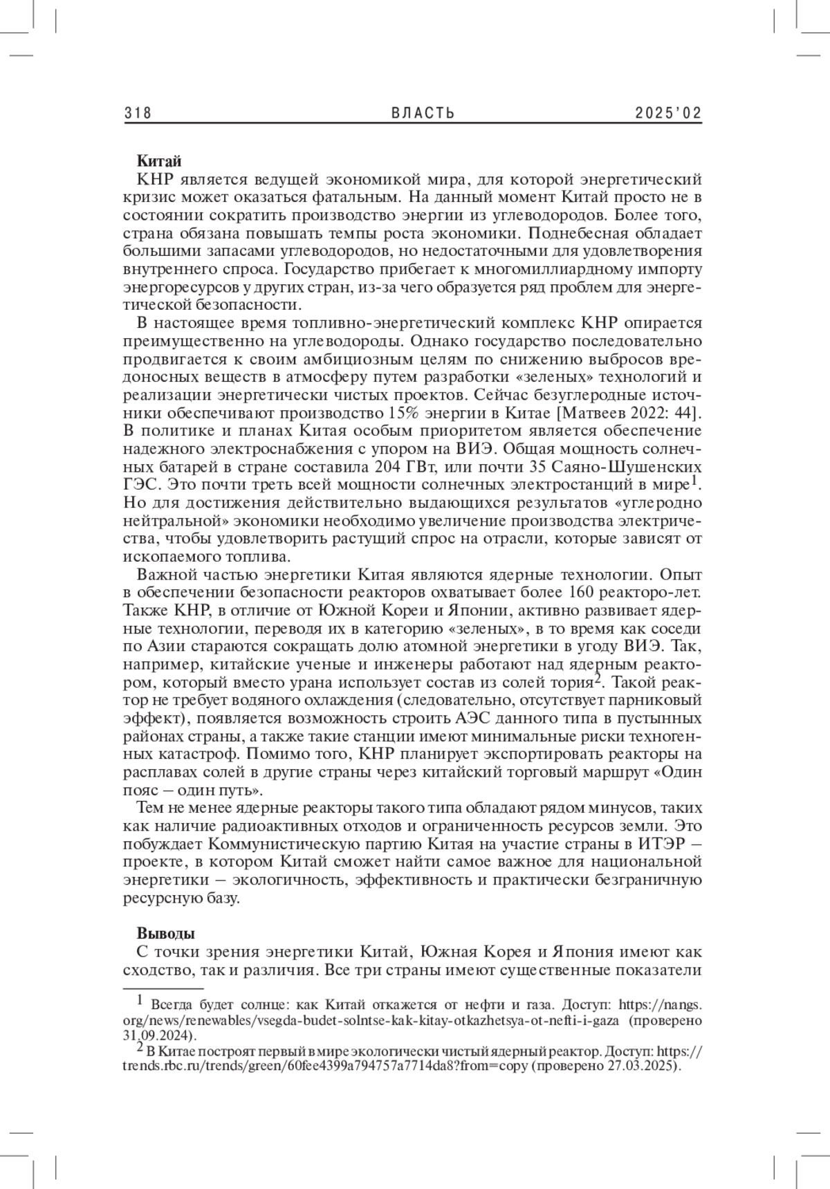 1. Матвеев В.А. 2022. Внешние и внутренние вызовы современной энергетической политики Китая. - Современная энергетическая политика Китая: внешние и внутренние вызовы. М.: Изд-во ИДВ РАН. С. 38-59.