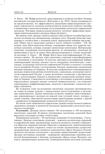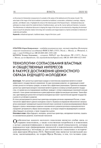 Автор определяет, что ценности современной российской молодежи носят двойственный, гибридный характер, сочетая в себе традицию и модерн. Эффективность конкурирующих дискурсов в формировании образа будущего определяется масштабом и глубиной дискурсивных предпочтений референтных групп сверстников в онлайн- и офлайн-коммуникациях. Эффективность трансляции цивилизационного дискурса в рамках учебного курса «Основы российской государственности» зависит от объема пересечения (конгруэнтности) подмножества ценностей, транслируемых в учебном пособии, и подмножества ценностей молодежи. Ценностная основа образа будущего учебного пособия представляется как традиционная, консервативная, цивилизационная, суверенная, религиозная, патриотичная, антизападная. Она акцентирует достоинства исторического прошлого Российской империи. Цивилизационный дискурс в меньшей степени обращается к модернистскому блоку традиционных ценностей, таких как «жизнь», «права и свободы человека», «гуманизм». Эффективность цивилизационного дискурса в формировании образа будущего можно повысить путем интеграции доминирующих ценностей молодежи в привлекательные среднесрочные/долгосрочные нарративы и образы, основанные на гибридном сочетании элементов модерна и традиции.