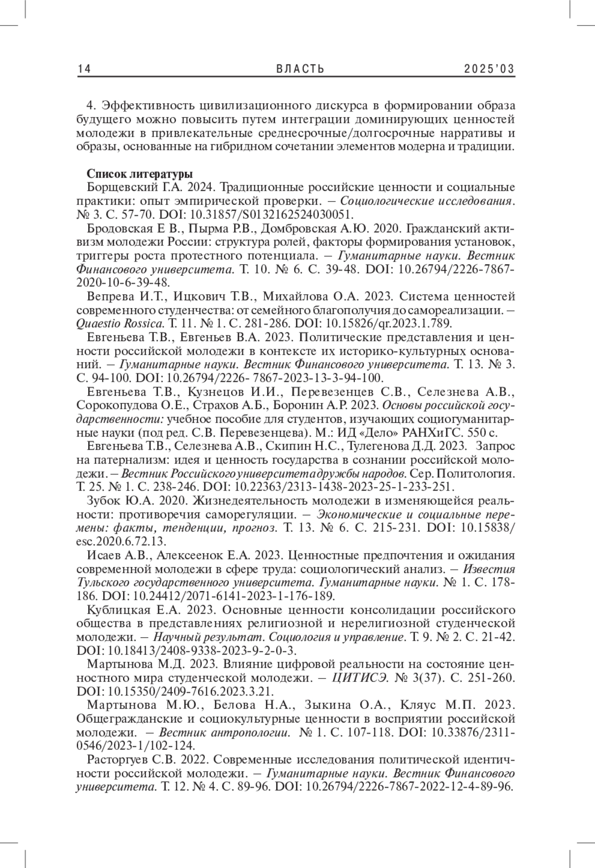 4. Евгеньева Т.В., Евгеньев В.А. 2023. Политические представления и ценности российской молодежи в контексте их историко-культурных оснований. - Гуманитарные науки. Вестник Финансового университета. Т. 13. № 3. С. 94-100. 10.26794/2226- 7867-2023-13-3-94-100. DOI: 10.26794/2226-7867-2023-13-3-94-100 EDN: DMFECJ