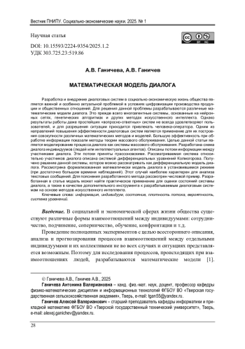 Разработка и внедрение диалоговых систем в социально-экономическую жизнь общества является важной и особенно актуальной проблемой в условиях цифровизации производства продукции и общественных отношений. Для решения данной проблемы разрабатываются различные математические модели диалога. Это прежде всего многоагентные системы, основанные на нейронных сетях, генетических алгоритмах и других методах искусственного интеллекта. Однако результаты работы даже простейших «вопросно-ответных» систем не всегда удовлетворяют пользователей, и для разрешения ситуации приходится привлекать человека-оператора. Одним из направлений повышения эффективности диалоговых систем является применение для их построения совокупности различных математических методов и моделей. Большую эффективность при обработке информации показали методы теории массового обслуживания. Целью данной статьи является моделирование процесса диалога как системы массового обслуживания. Разработана схема диалога индивидуумов (людей или интеллектуальных агентов). Описаны потоки информации между участниками диалога. Эти потоки приняты пуассоновскими. Рассматриваемая система относительно участников диалога описана системой дифференциальных уравнений Колмогорова. Получено решение данной системы, которое можно рассматривать как дифференциальную модель диалога. Рассмотрена формализованная математически модель диалога в установившемся режиме (при достаточно большом времени наблюдений). Этот случай наиболее характерен для анализа текстовых сообщений. Для пояснения разработанного метода рассмотрен числовой пример. Разработанная в статье модель может найти практическое применение для оценки состояний системы диалога, а также в качестве дополнительного инструмента к разрабатываемым диалоговым системам на основе методов искусственного интеллекта.