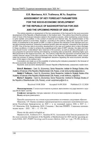 Представлена оценка ключевых параметров прогноза социально-экономического развития Республики Башкортостан на среднесрочный период. Авторами выявлено, что достижение большинства прогнозных показателей, заявленных в базовом сценарии, при сохранении текущих тенденций является вполне реалистичным и обоснованным. В условиях возникновения внешних и внутренних рисков более вероятным является реализации консервативного сценария. Однако, по мнению авторов, с учетом вклада инвестиций в рост ВРП для достижения показателей, заложенных в базовом и консервативном сценариях прогноза, необходимы опережающие темпы роста инвестиций, по сравнению с динамикой ВРП. Одним из ключевых рисков развития экономики в ближней и среднесрочной перспективе является дефицит рабочей силы. В этих условиях для достижения прогнозных темпов роста объемов ВРП государству и бизнесу следует вовлекать в экономику «недоиспользованные» трудовые резервы, а также активно участвовать в различных программах по подготовке и переподготовке кадров, повышению производительности труда, привлечению высококвалифицированных кадров в экономику региона и др. Авторами отмечено, что в представленном документе отсутствуют прогнозные значения индекса производительности труда Республики Башкортостан, что затрудняет процесс принятия обоснованных управленческих решений относительно социально-экономического развития региона в среднесрочной перспективе. В заключение представлены выводы о возможности достижения показателей, представленных в прогнозе социально-экономического развития региона.